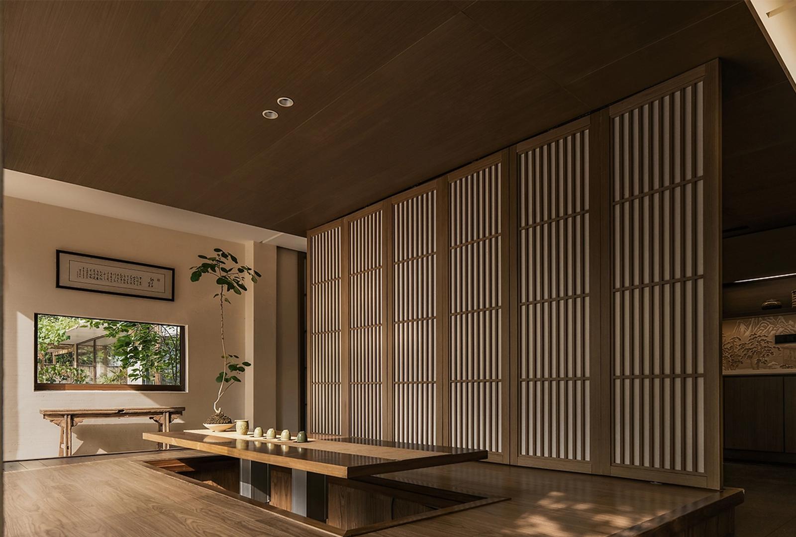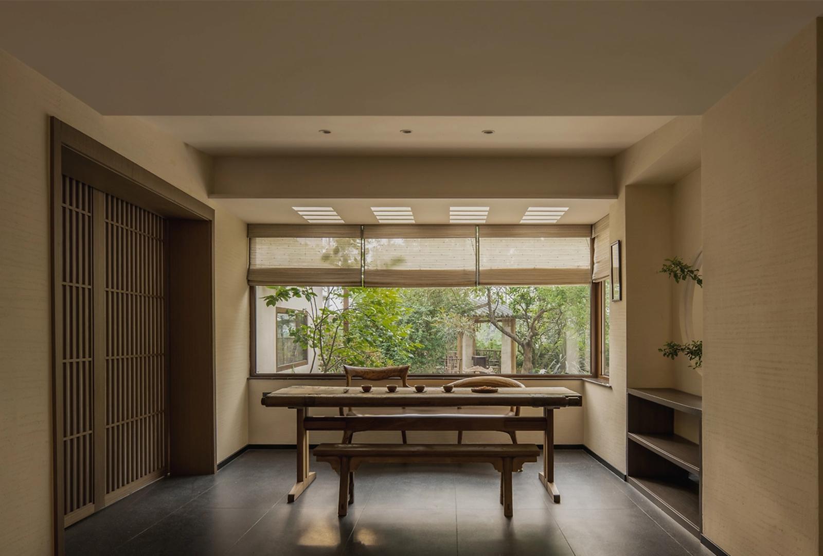 室内空间设计布局遵循 “隔而不断,通而不透” 的中式智慧 。大量运用木质格栅屏风,如细密木条编织的隔断,将空间巧妙划分 —— 茶室与休憩区、卧室与休闲角,既界定功能边界,又让视线与光线自由穿梭,保有空透感。开放式的公共区域,如茶室长桌贯通,方便亲友相聚;而室外露台借助大折叠窗,完全打开时,室内外边界消融,清风与绿意无阻涌入,延展空间维度,实现建筑与自然的对话,让人在起居间随时感知四季流转。
