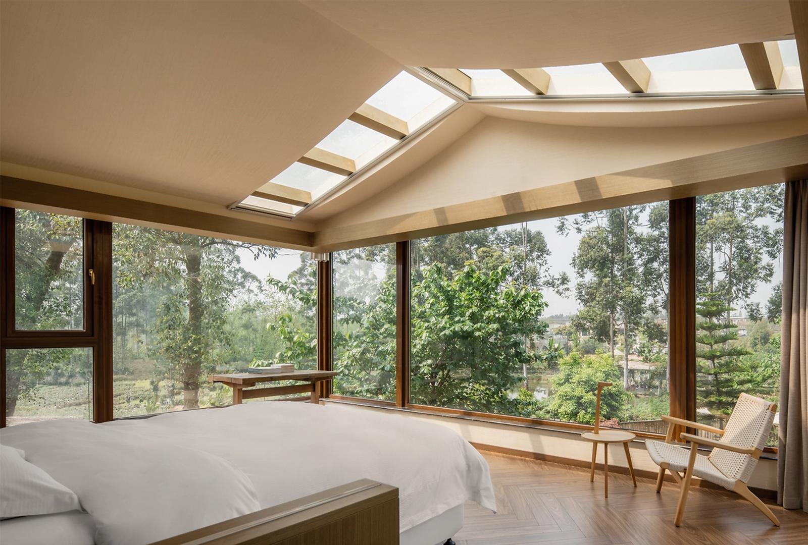 场景设计兼顾实用与审美,涵盖多元生活功能。茶室是核心之一,长桌上茶具规整摆放,可煮茶论道、会友谈天,格栅后光影朦胧,复刻中式 “茶寮” 的雅趣;卧室区简约床铺配柔和灯光,藤编元素软化空间,大窗引入自然采光,晨起见绿意、暮落赏晚霞,实现居住的舒适与诗意。休闲角落的矮凳、小茶几,供人静坐阅读、观景发呆,让每一处空间都承载 “慢下来” 的生活片段,传递出舒缓、静谧的生活美学,重拾中式传统里 “偷得浮生半日闲” 的松弛感。