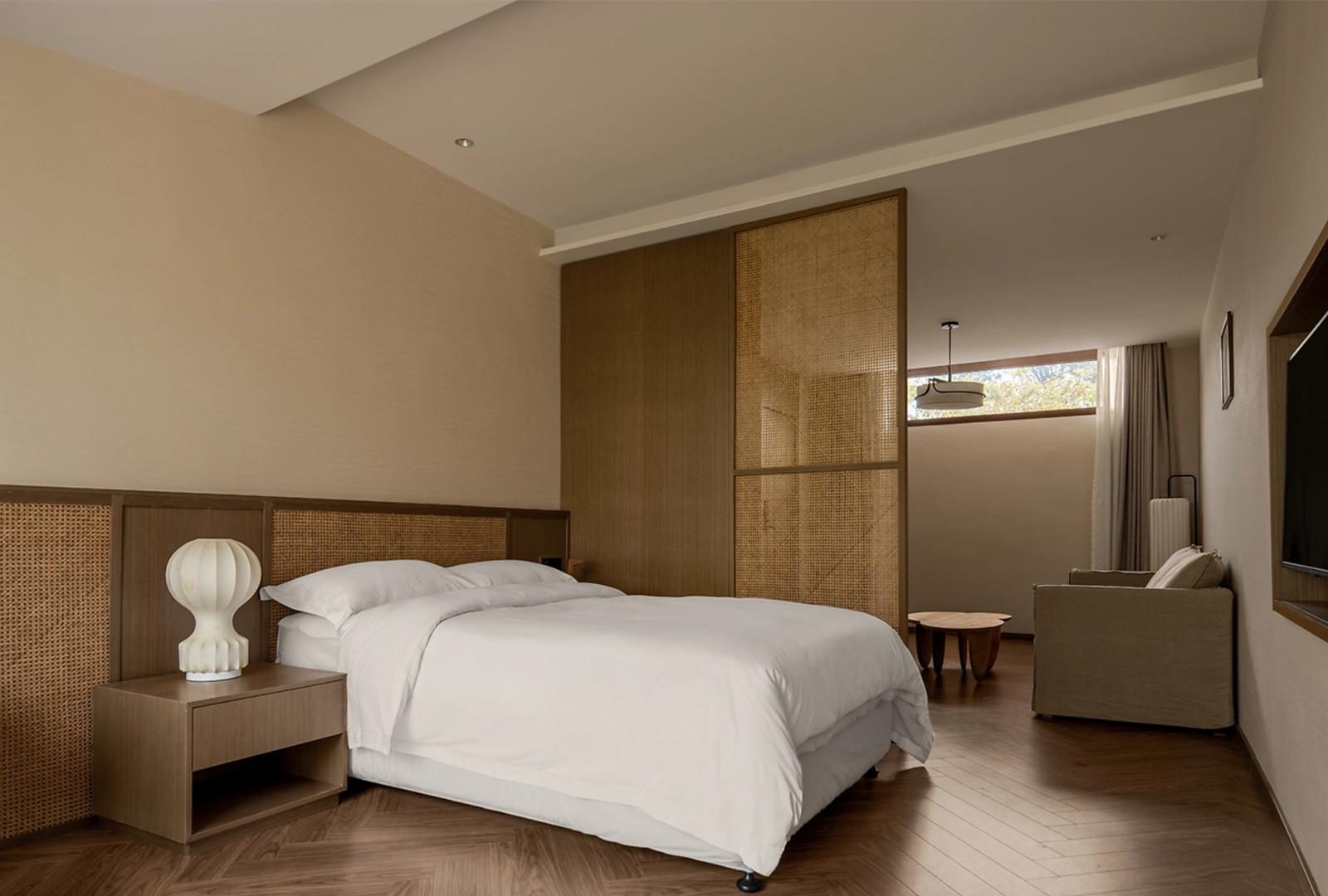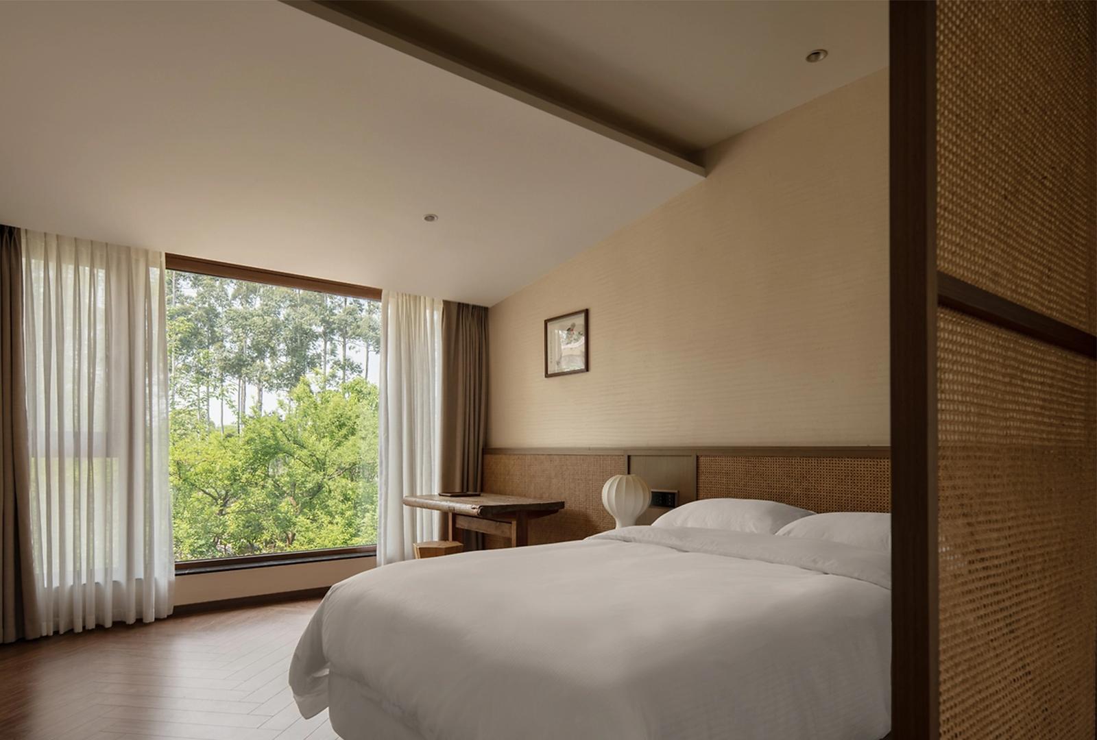 室内设计材质选择以木、藤、麻等自然原生材料为主,呼应中式 “天人合一” 思想。温润的木质地板、家具,带着天然纹理与岁月质感;藤编床头、屏风,散发质朴肌理,触摸间传递自然温度。色彩上摒弃浓艳,以暖棕、米白、浅灰为基调,如墙面柔和的米白,似中式宣纸般素雅,搭配木质的深棕,营造出沉稳又宁静的氛围。零星点缀的绿植,如茶室案头的盆栽、露台的小型乔木,让空间鲜活起来,成为自然与人文的连接点,疗愈都市人的心。