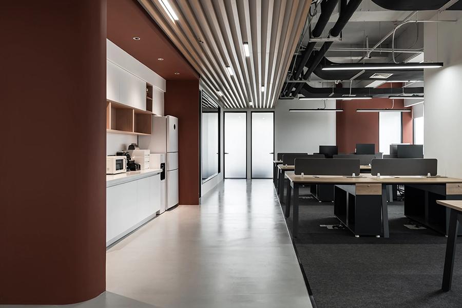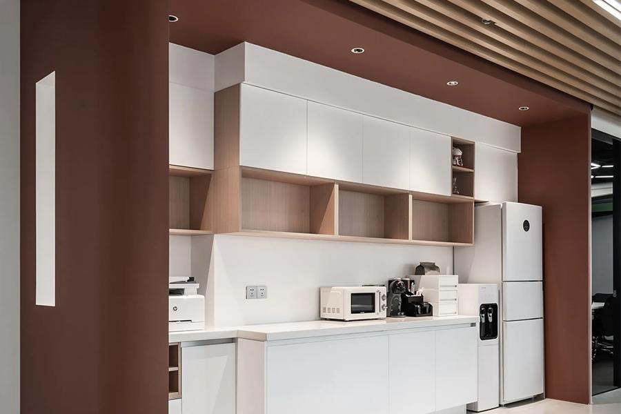 办公空间里还贴心地设置了休闲区。这里有微波炉、冰箱等设备,员工可以在这里加热自带的午餐,或是冲泡一杯咖啡,享受片刻的休闲时光。整齐的储物柜和置物架,方便大家存放一些办公用品或个人物品,让整个空间保持整洁有序。