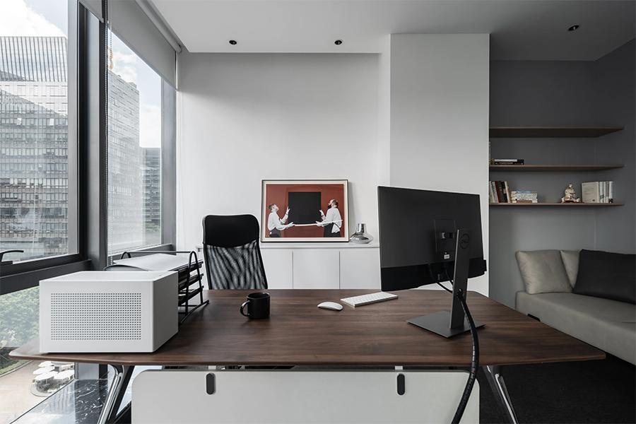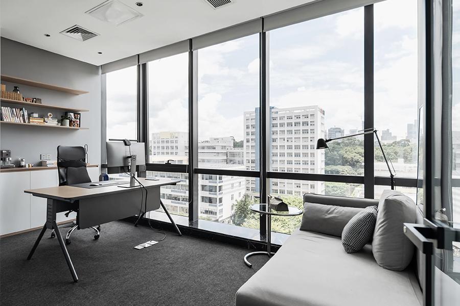 沿着通道往里走,便来到了独立办公室。相较于开放办公区的热闹,这里多了一份静谧与私密。宽敞的办公桌、舒适的办公椅,为管理者或需要深度思考的员工提供了绝佳的工作环境。墙上挂着的艺术画作,为严肃的办公空间增添了一丝艺术气息,也能在不经意间激发灵感。旁边的沙发区则是一个可以短暂放松或进行小型非正式交流的好去处,让工作不再只有紧张与忙碌。透过办公室的窗户,城市的繁华景象尽收眼底,工作之余,抬眼望望窗外的风景,能很好地缓解视觉疲劳与精神压力。