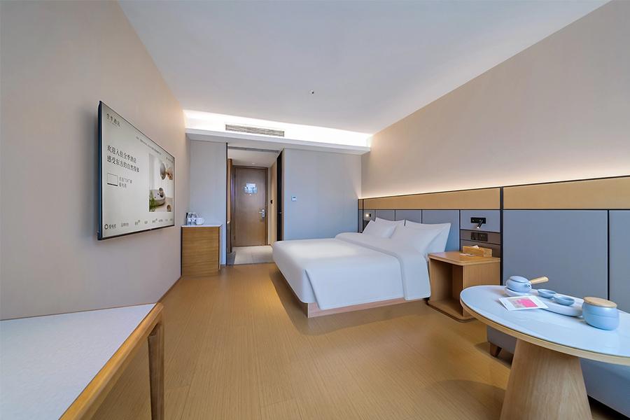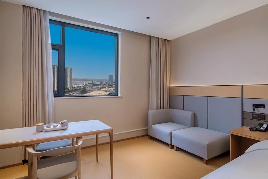 大床房的设计,则更显开阔与雅致。一张大床占据视觉中心,白色的床品纯净如雪,躺卧其上,柔软的触感让人瞬间放松。房间的采光是一大亮点,壹西格玛巧妙利用窗户,将雅安的天光引入室内。晴天时,阳光透过窗帘的缝隙洒落,在地板上投下斑驳的光影,整个空间明亮而充满生机;阴天时,室内的灯光适时补位,暖黄的光线让空间依旧温馨宜人。房间内还设置了休闲角落,一把简约的沙发椅、一张小圆桌,构成了一个私享的小天地。你可以在此处翻看一本带来的书籍,或是静静眺望窗外雅安的城市或自然景致,让身心在这一方小空间里,与雅安的节奏同频。