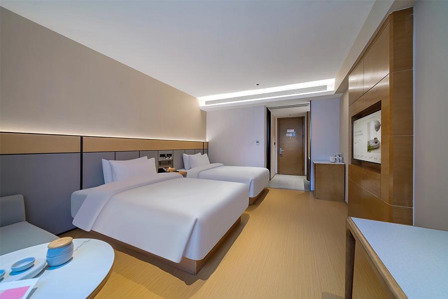 酒店的客房区域,是壹西格玛诠释 “舒适” 的核心场域。双床房内,两张床品洁白、线条简洁的床平行摆放,像是为旅伴们准备的 “默契港湾”。床头背景墙采用了浅棕与灰色的拼接设计,木质的温润质感与灰色的沉稳相得益彰,搭配上柔和的灯带,在夜晚营造出如雅安夜色般静谧又温暖的氛围。房间地面选用的是浅木色地板,脚感舒适,行走其上,仿佛能触摸到雅安山林间的自然肌理。桌上摆放着茶具,若恰逢闲暇,泡上一壶雅安本地的蒙顶茶,看茶叶在杯中舒展,香气袅袅升腾,旅途中的奔波劳碌,似乎也在这茶香与舒适的空间里,渐渐消散。