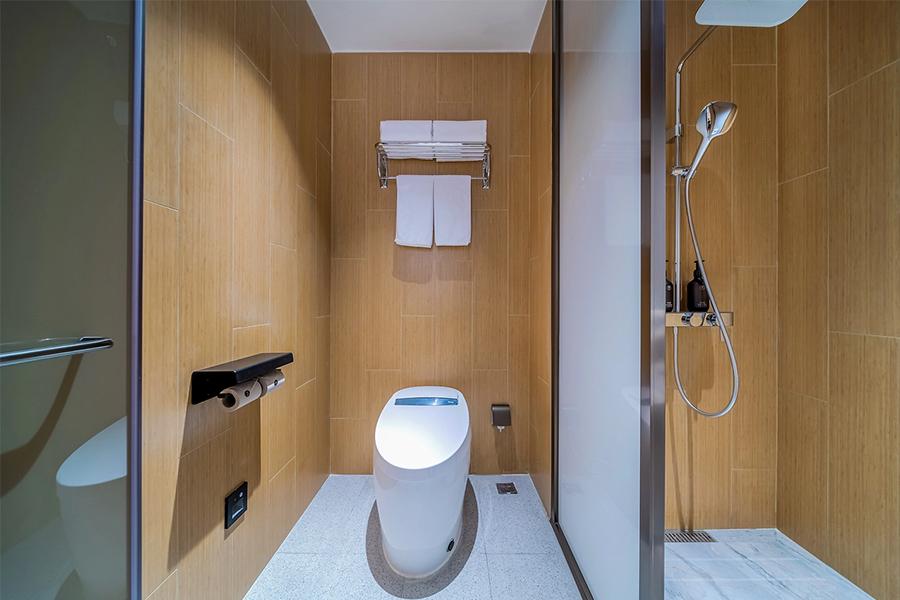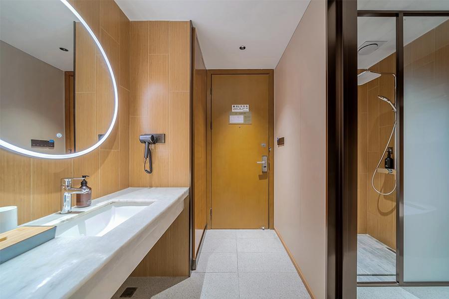 卫浴空间的设计,同样体现着壹西格玛的用心。木质的墙面装饰,传递出自然的气息,与雅安的生态之美遥相呼应。白色的洗漱台干净整洁,搭配上圆形的带灯镜子,不仅满足了实用功能,更增添了一丝时尚感。独立的淋浴区采用玻璃隔断,让空间显得通透不局促,水流从花洒中喷洒而出,冲走一身的疲惫,仿佛能将在雅安游玩时沾染的尘土与倦意,都一并洗涤干净。