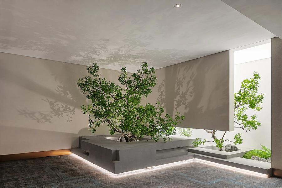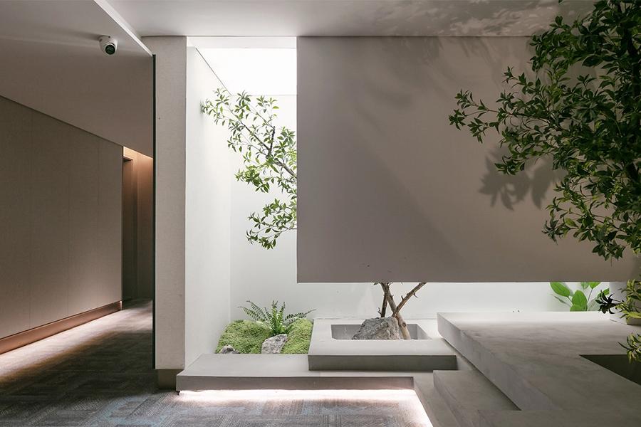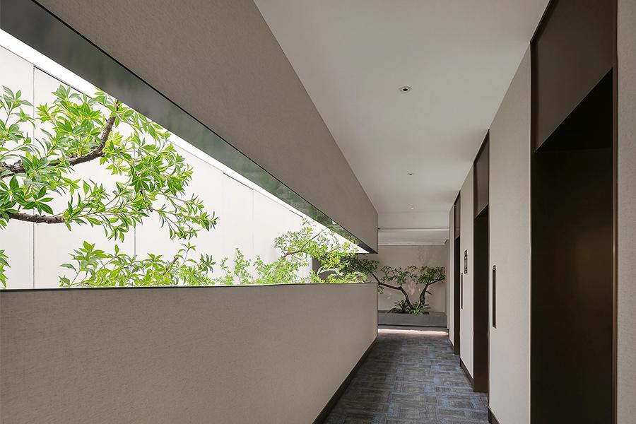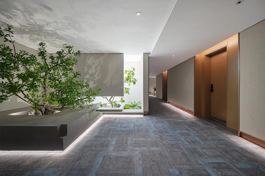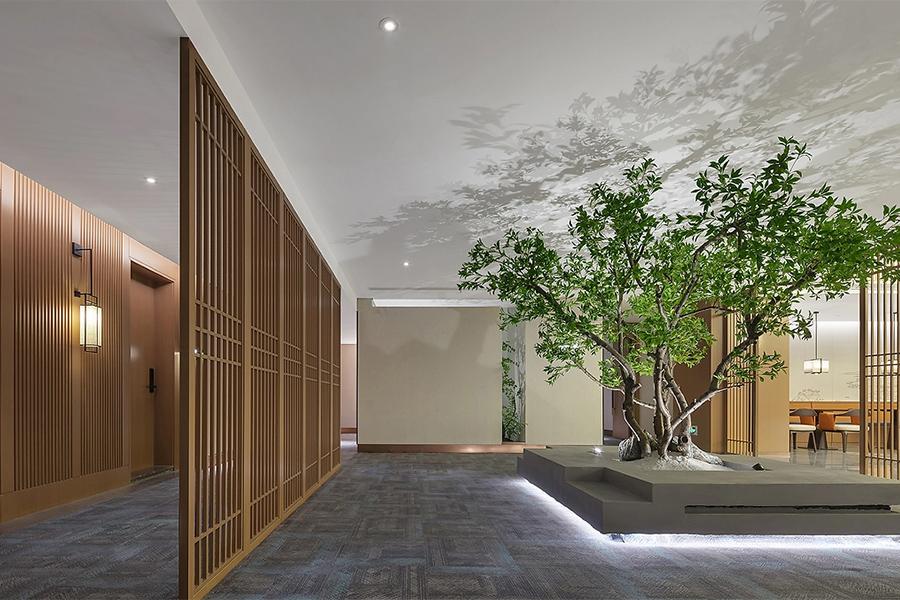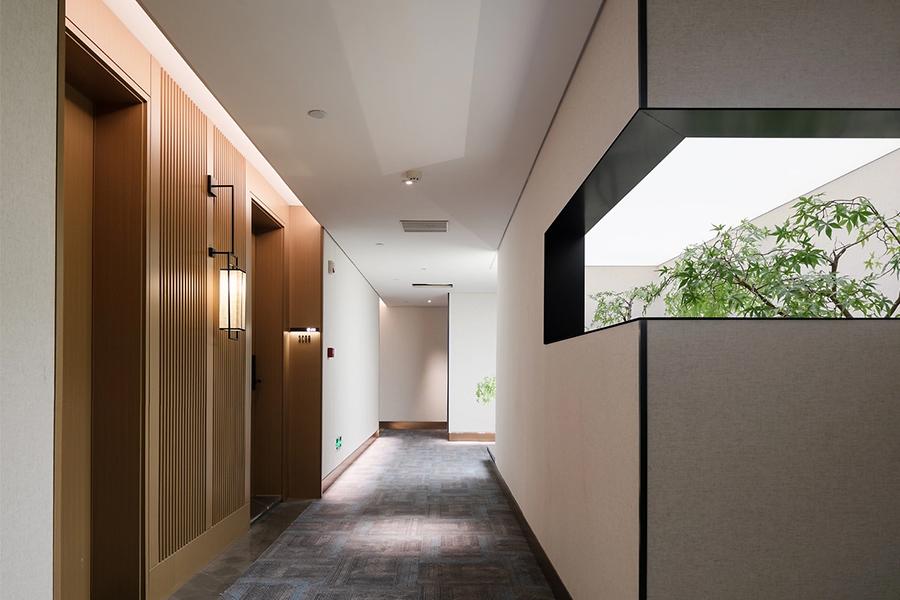 酒店的走廊设计,也充满了巧思。木质的房门与墙面装饰,延续了整体的设计风格,营造出统一的视觉体验。走廊一侧的镂空设计,引入了绿植景观,为狭长的走廊增添了一抹生机与自然意趣,仿佛是阿坝州山林在建筑内部的延伸,让行走在走廊中的人,也能感受到自然的气息。