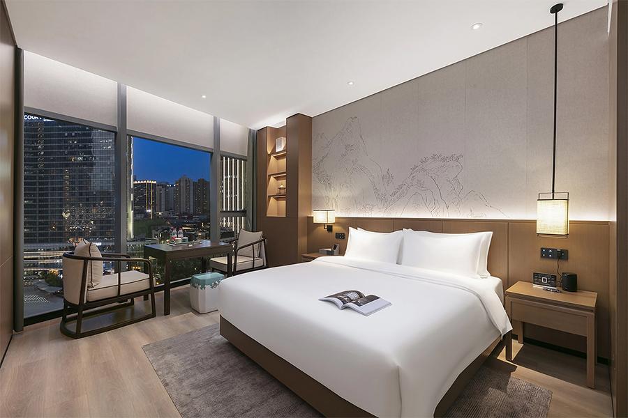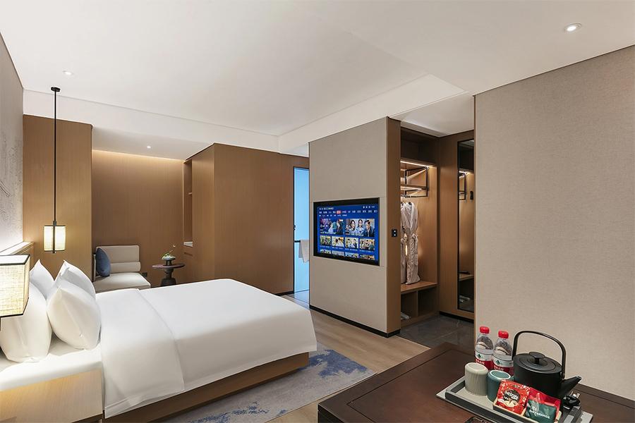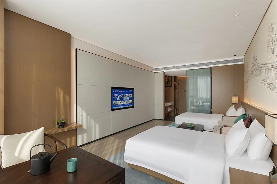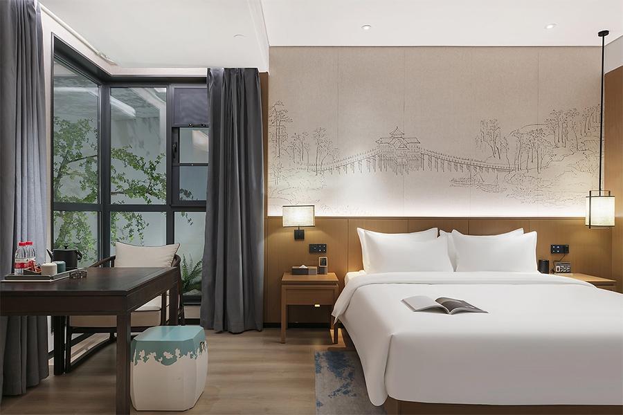 酒店的客房设计,是一场现代与传统的优雅对话。踏入客房,首先映入眼帘的是简约大气的布局,木质元素广泛运用,从墙面到家具,温润的木色如阿坝州山林的底色,传递出自然的质朴与亲和。而床头背景墙上的山水、桥梁等线条勾勒,又巧妙融入了阿坝州独特的地域文化符号,仿佛将阿坝州的山水画卷悄然铺展于室内,让住客即便身处室内,也能感受到这片土地的灵秀与韵味。