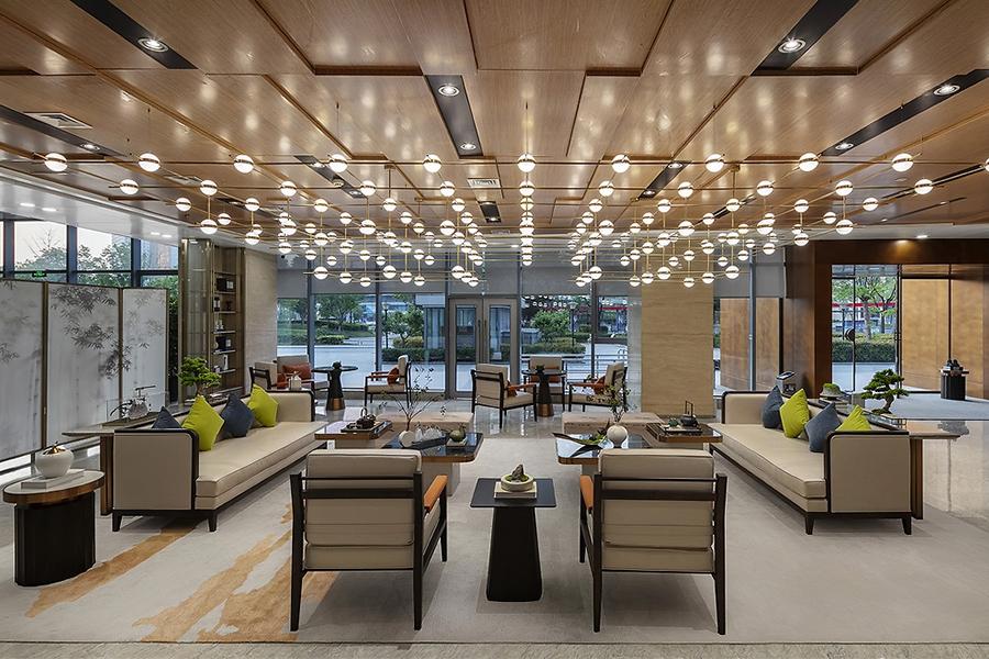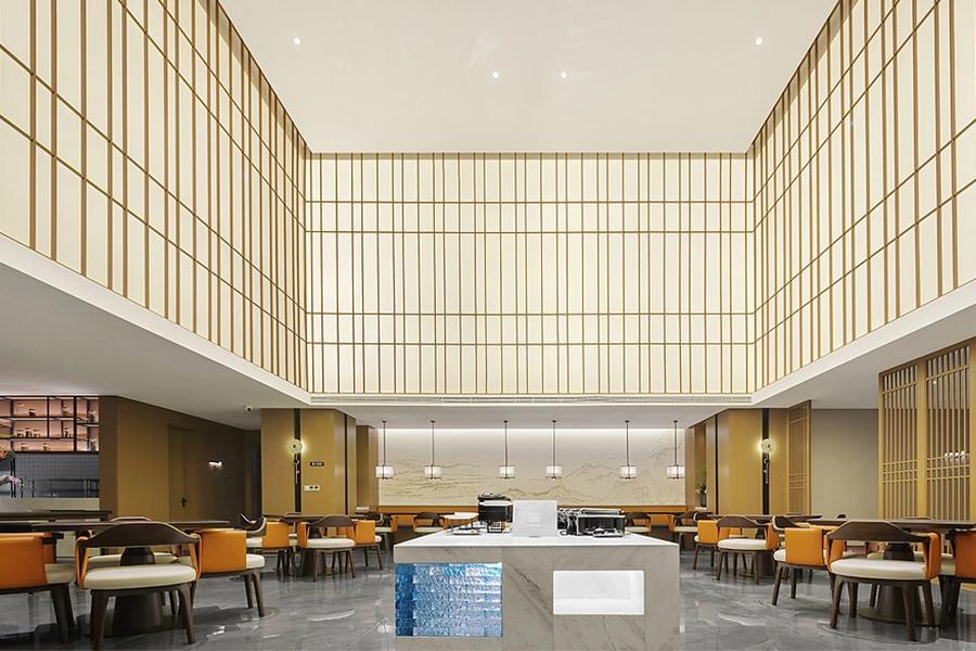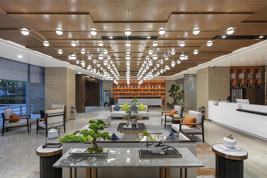 酒店大堂,作为接待宾客的第一站,更是尽显大气与雅致。天花板上独特的灯具设计,如繁星般点缀,散发着柔和而明亮的光芒,瞬间抓住人们的目光。木质的天花板与墙面装饰,与阿坝州的自然环境相呼应,传递出自然、质朴的质感。大堂中央的陈设,无论是造型别致的绿植,还是精心摆放的艺术品,都彰显出设计的用心,为整个空间增添了艺术氛围与文化底蕴。在这里,宾客刚踏入酒店,就能感受到一种宾至如归的温暖与高雅的格调。