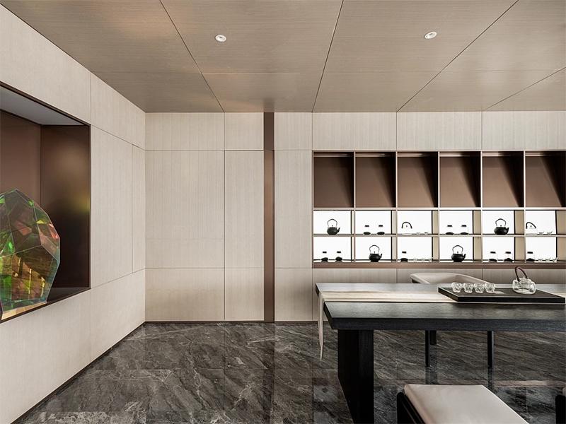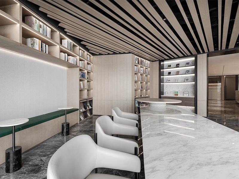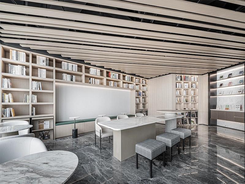空间规划上遵循“功能与美学共生”原则,这也是成都办公室装修设计的核心思路之一,各区域划分清晰却又彼此呼应。进门处的茶歇区是空间的点睛之笔,定制实木茶桌搭配整套青瓷茶具,一旁的玻璃展示柜内陈列着各式茶壶与茶饼,成为接待客户、团队小憩的温馨角落,氤氲茶香中尽显东方雅致。相邻的阅览休闲区则营造出静谧氛围,顶天立地的书架摆满行业典籍与人文著作,浅灰色布艺沙发与原木茶几组合,为员工提供了放松阅读、灵感交流的舒适场域。