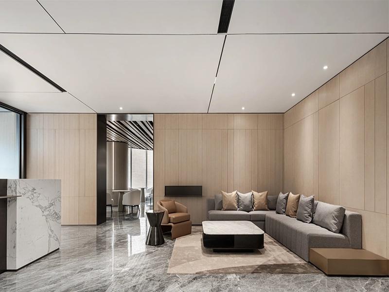 | 案例简介 | 成华区这套560平米的现代风格办公室,以“简约而不简单”为设计内核,正是成都办公室装修设计中对“质感与实用”追求的典型体现。通过木质元素与大理石材质的精妙碰撞,勾勒出沉稳雅致的空间气质。温润的胡桃木饰面遍布墙面与柜体,搭配浅灰色大理石地面,在光影流转间呈现出自然与轻奢的平衡,既避免了商务空间的冰冷感,又彰显出企业的专业底蕴。 |