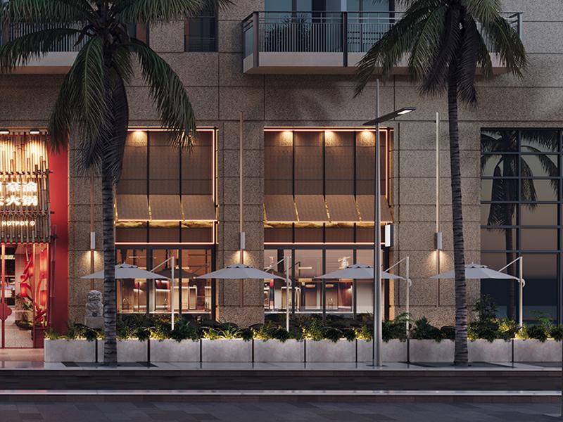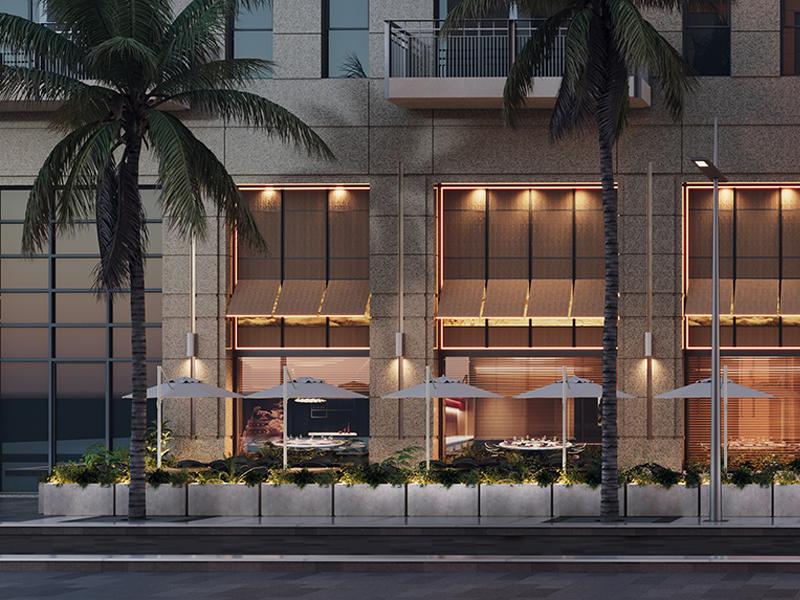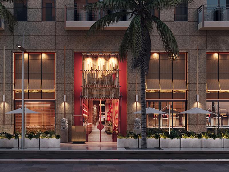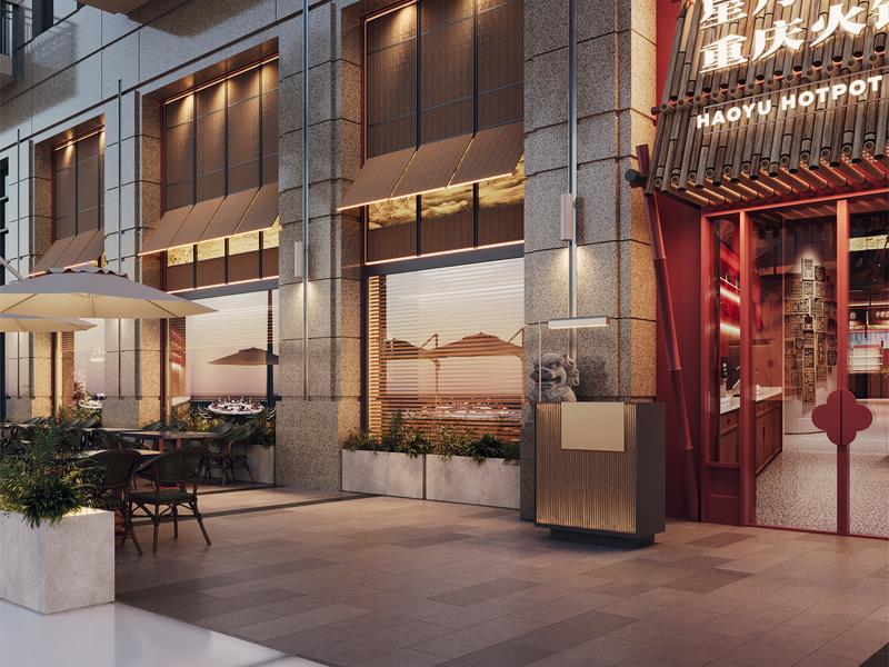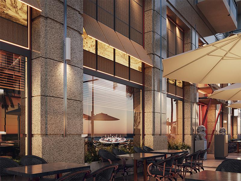 外部设计则聚焦 “质感呈现” 与 “场景延伸”。石材墙面自带高级质感,搭配通透的大玻璃窗,既保证了室内采光,又让过往行人能窥见内部的中式氛围,形成视觉吸引;户外用餐区的设计则贴合现代食客的休闲需求,桌椅搭配遮阳伞提供舒适的用餐环境,棕榈树等植物点缀其间,营造出轻松惬意的氛围,拓展了餐厅的使用场景。四川壹西格玛装修公司通过对外部空间的精心设计,进一步强化了餐厅的整体风格,提升了食客的用餐体验。