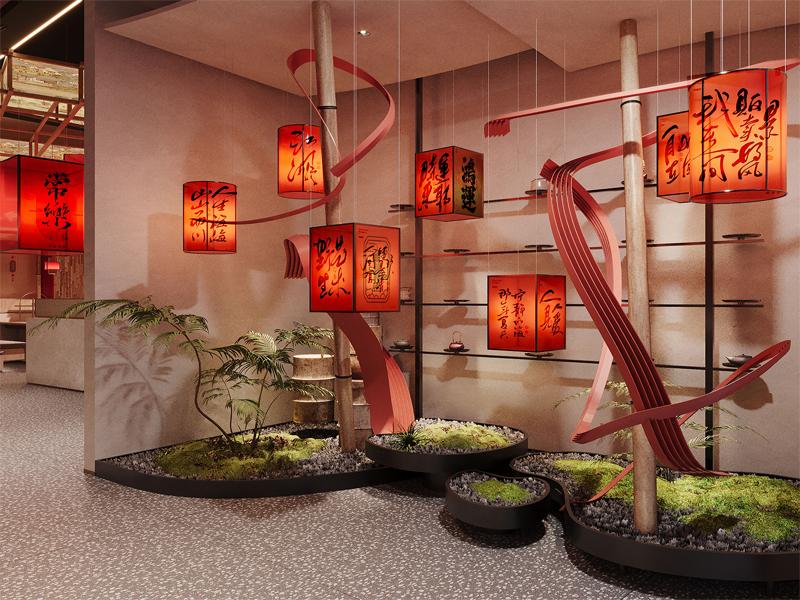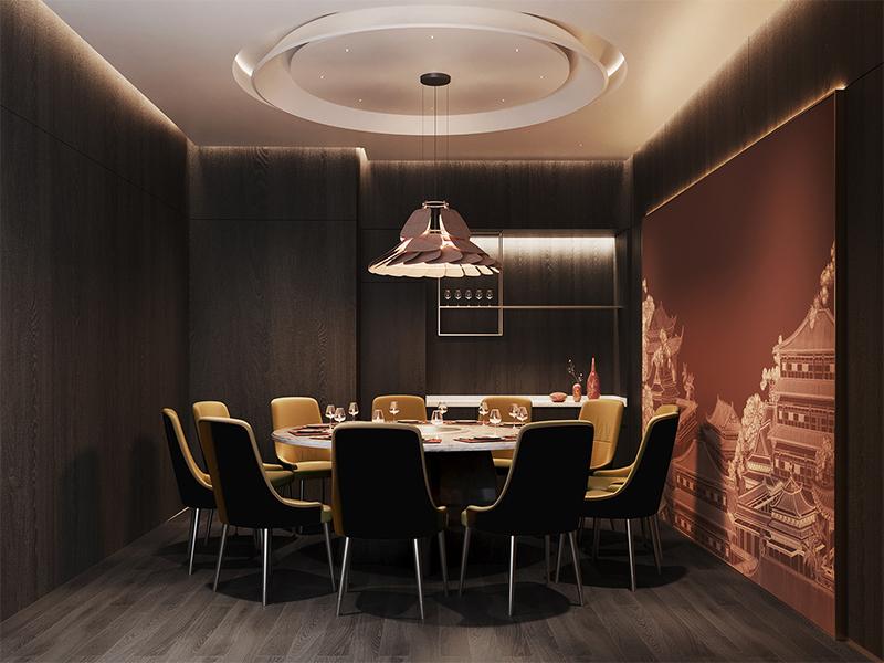 包间设计更显精致感与仪式感。圆形餐桌契合中式 “团圆” 的饮食文化,搭配造型简约的特色吊灯,柔和光线聚焦用餐区域,提升氛围温馨度;墙面中式壁画与整体风格呼应,避免了空间的单调,让典雅气质渗透到细节中。此外,角落的绿植与艺术装置是四川壹西格玛装修公司设计的巧妙补充,绿植的自然生机中和了中式元素的厚重感,艺术装置则注入现代审美,让空间兼具自然气息与艺术格调,缓解用餐时的视觉疲劳。