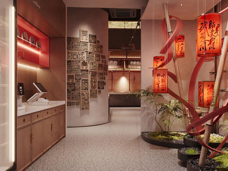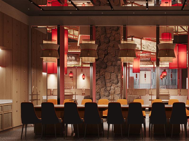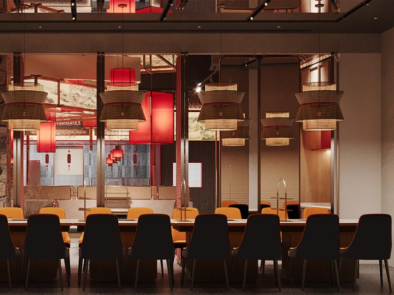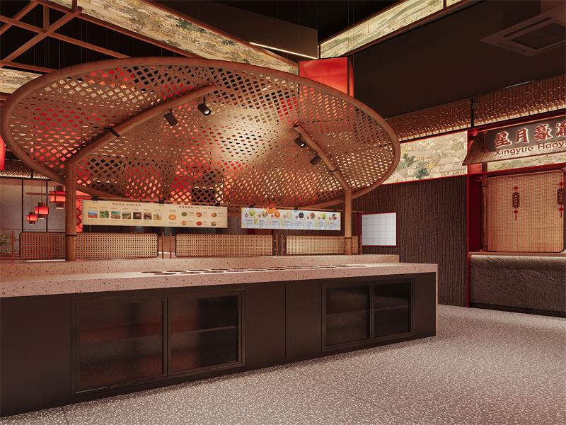 从内部空间设计来看,四川壹西格玛装修公司围绕 “中式氛围营造” 与 “功能实用性” 展开整体规划。公共用餐区悬挂的红色书法灯笼是点睛之笔,红色作为中式文化中的吉祥色,搭配传统书法字体,瞬间唤醒食客的文化记忆,奠定浓郁的中式基调。桌椅设计摒弃了传统中式家具的厚重感,在保留木质纹理等中式元素的同时,采用符合人体工学的弧度与软包材质,实现 “美观” 与 “舒适” 的平衡,尽显设计巧思。档口区域的设置则兼具展示与互动功能,透明化的美食制作或展示过程,既满足现代食客对食材安全的关注,又增添用餐趣味性,充分体现了四川壹西格玛装修公司对空间功能的深度考量。