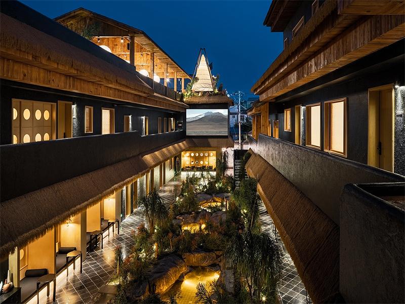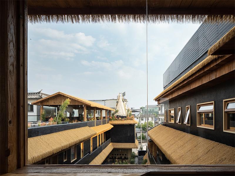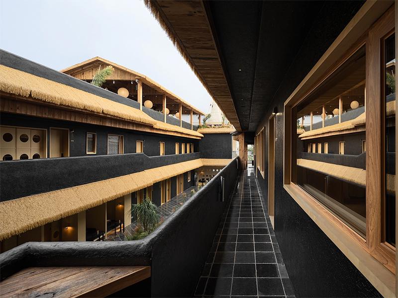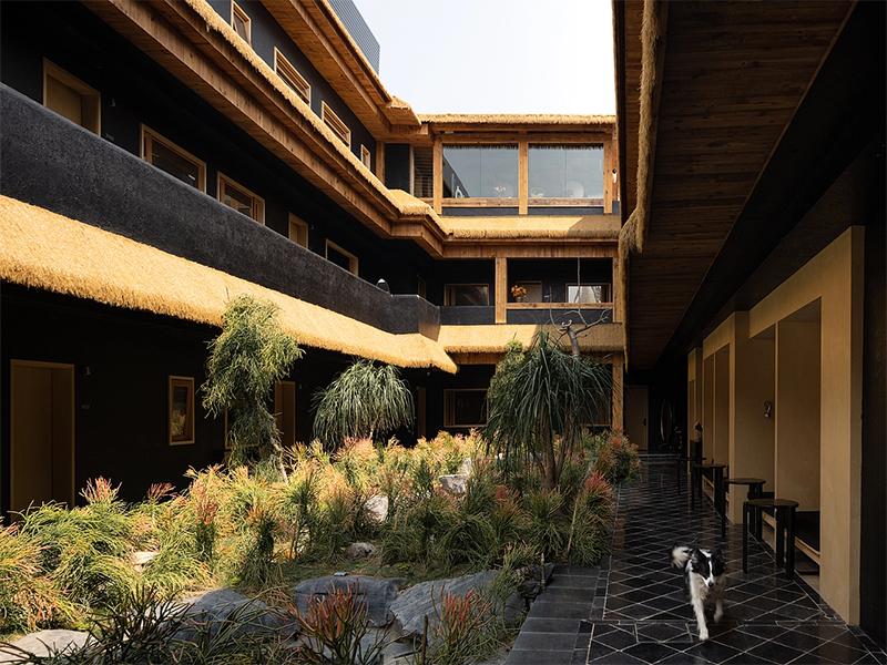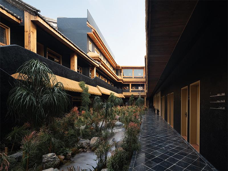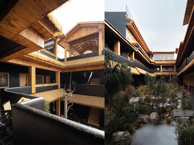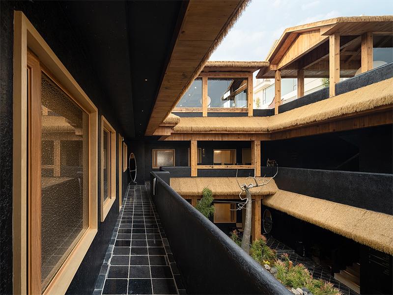 建筑外观以黑、木色为主调,黑色金属框架勾勒简洁线条,与温润木色外墙对比鲜明,沉稳大气。屋顶用茅草质感材料,既还原传统风貌,又具隔热功能,兼顾视觉与实用。墙面局部饰木质格栅,保证采光且添传统韵味,光影下墙面形成斑驳效果,为庭院增诗意。