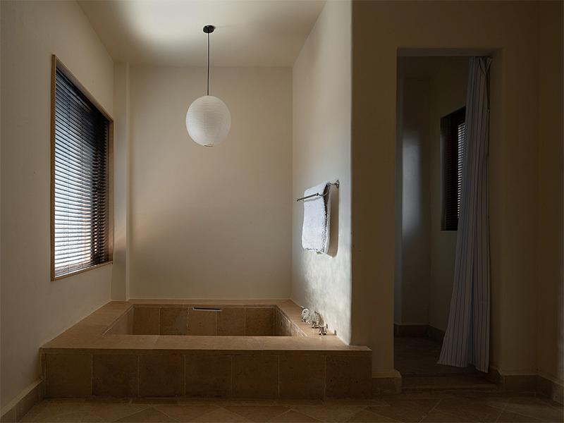浴室兼顾质感与实用,墙面、地面铺浅灰色防滑石材。中央放独立式石材浴缸,造型简约,天然纹理显高级,泡澡时可通过小窗赏庭院景。浴室配恒温花洒、智能马桶等现代卫浴设施;天花板装嵌入式筒灯与排气扇,保障照明与通风。设独立淋浴区,用透明玻璃隔断分隔干湿。洗漱台为白色陶瓷台面配实木柜体,台面上放简约洗漱用品,上方圆形镜子镶 LED 灯带,照明清晰,方便整理仪容。