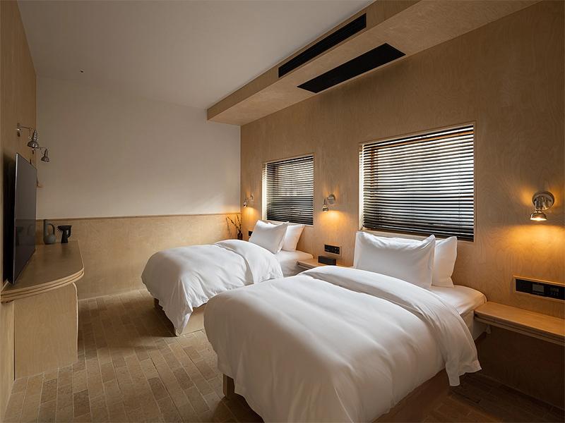 床品选纯棉材质,配浅灰色床尾巾与抱枕,简洁温馨。床头装简约球形壁灯,暖黄光柔和不刺眼。房间一侧设休闲区,摆实木茶几与藤椅,可品茗阅读。客房配大尺寸落地窗,拉开窗帘能将庭院绿植、流水与山石尽收眼底,亲近自然。