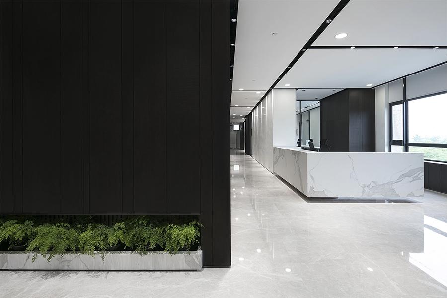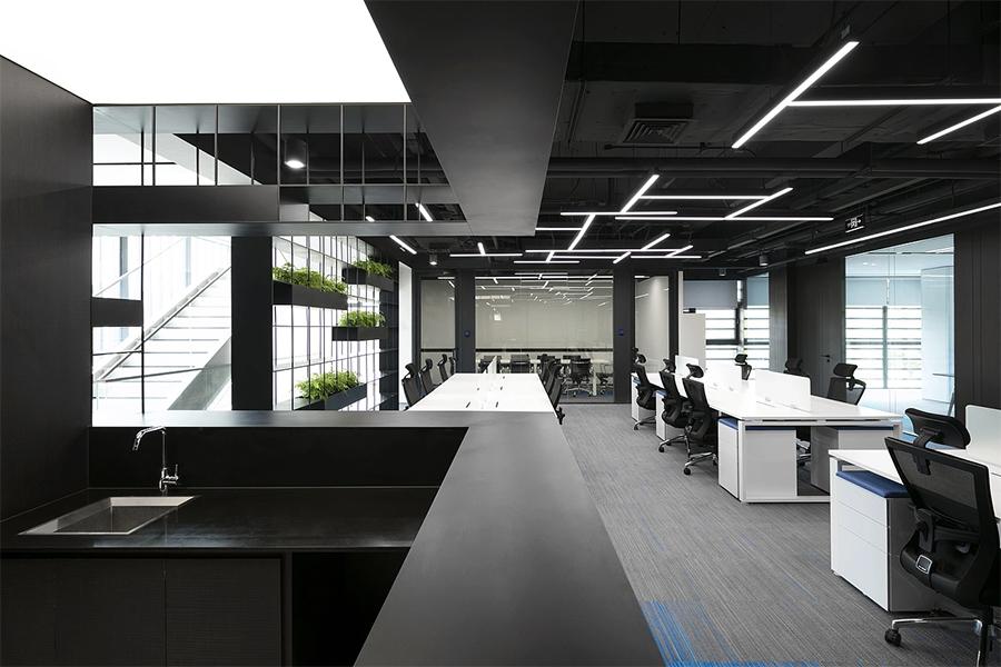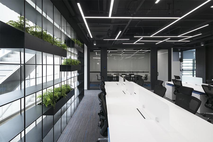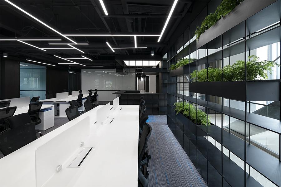 而在一些细节之处,更能体现四川壹西格玛的匠心独运。玻璃隔断的使用,让空间在视觉上更加通透开阔,同时也保证了各个功能区域的相对独立。隔断上精心布置的绿植,如同一串串绿色的风铃,为冷峻的玻璃增添了生机与灵动。地面的地毯,采用了带有蓝色线条的设计,既起到了吸音降噪的作用,又为空间注入了一抹清新的色彩,与整体的黑白灰主色调形成鲜明对比,让空间不至于陷入单调。