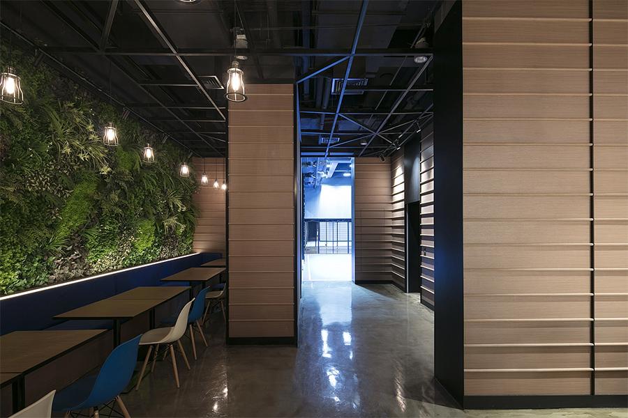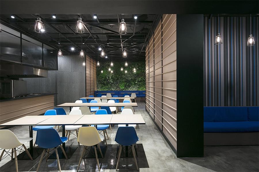 在公共休闲区域,设计同样别具一格。这里像是一个小型的 “城市会客厅”,舒适的蓝色沙发与简约的桌椅相得益彰,员工可以在这里放松身心、交流思想,或是进行一场轻松的头脑风暴。灯光的设计也颇为讲究,暖黄色的吊灯散发着柔和的光芒,营造出温馨惬意的氛围,让员工在忙碌的工作之余,能有一个可以舒缓压力的角落。