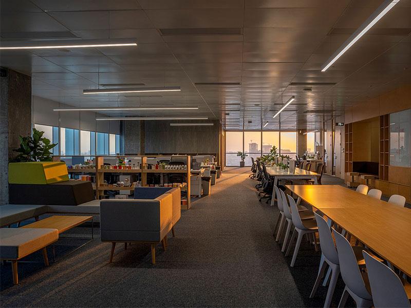 办公区更是设施齐全,整齐的工位为员工提供了专注工作的空间,而精心布置的沙发等休闲设施,则让员工在忙碌之余有了可以放松身心的角落。整体设计简约大气,没有多余的装饰,却通过对空间、材质、色彩的精准把握,营造出一种时尚且富有格调的氛围。