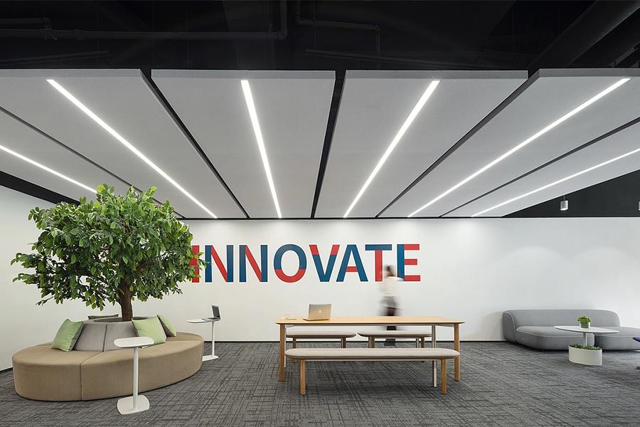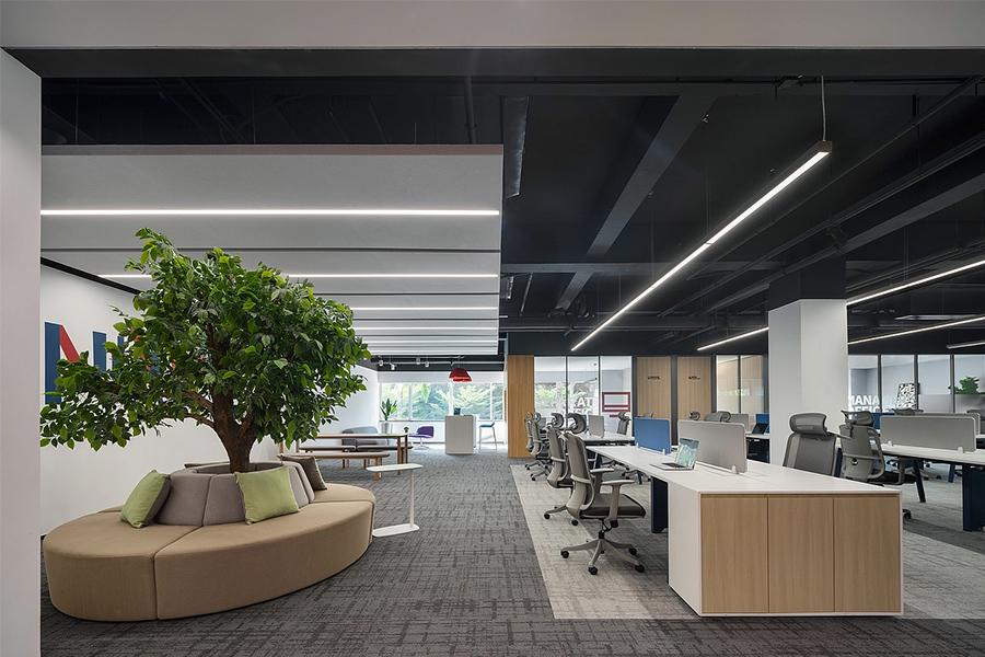 办公区内还精心打造了休闲交流区,这里宛如一片 “都市绿洲”。柔软的沙发、造型别致的圆形座椅,围绕着一株郁郁葱葱的仿真树错落摆放。员工们可在此短暂休憩,让思绪在绿意中沉淀;也能开展一场轻松的头脑风暴,让创意在舒适的环境里肆意生长。当阳光透过宽大的玻璃窗倾洒而入,与室内的绿植交相辉映,仿佛将自然的生机与活力都引入了这一方小天地,疲惫与压力在这样的环境中悄然消散。