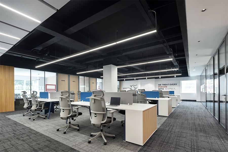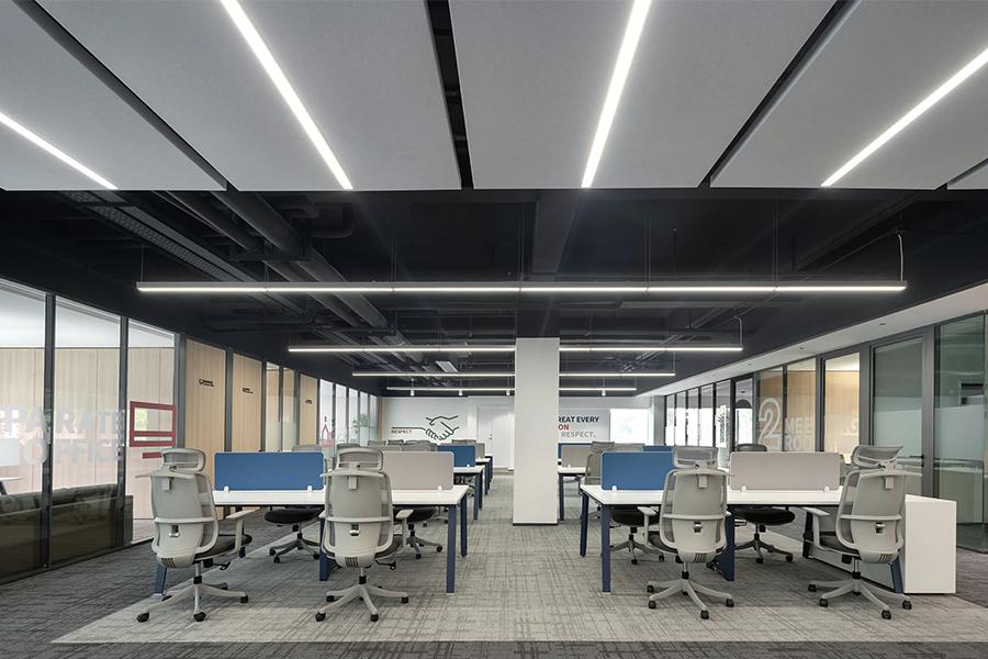 目光流转至办公区,开阔的布局令人心旷神怡。四川壹西格玛建筑工程有限公司采用开放式设计,摒弃了传统办公空间的刻板隔断,让团队协作的氛围自由流淌。整齐排列的办公桌椅,选用舒适且具现代感的款式,浅木色与白色的搭配,营造出温暖自然的办公氛围。顶部的线性灯光,如同一道道流光,不仅提供了充足照明,更赋予空间科技感与灵动性,使整个办公区既充满专注工作的氛围,又不失轻松活泼的气息。