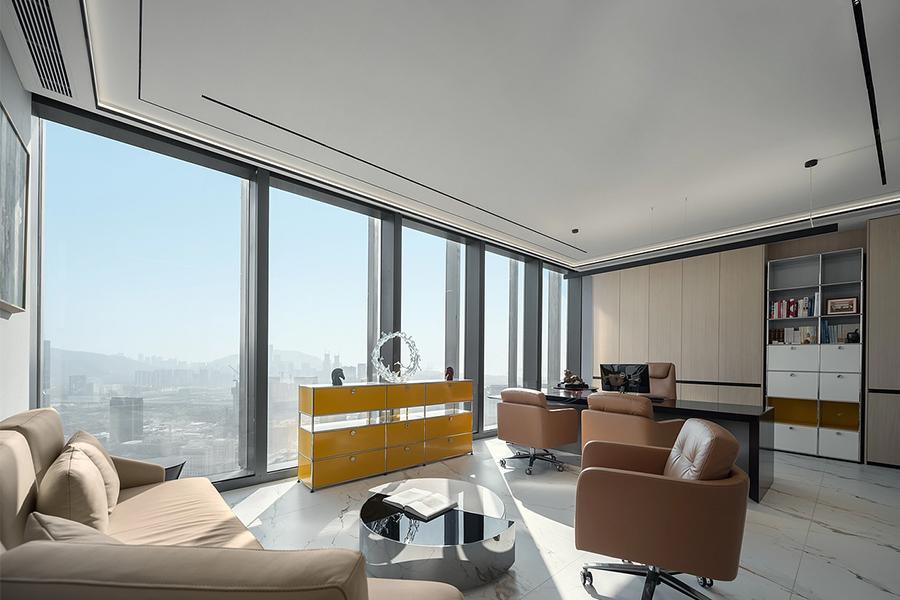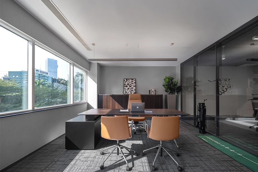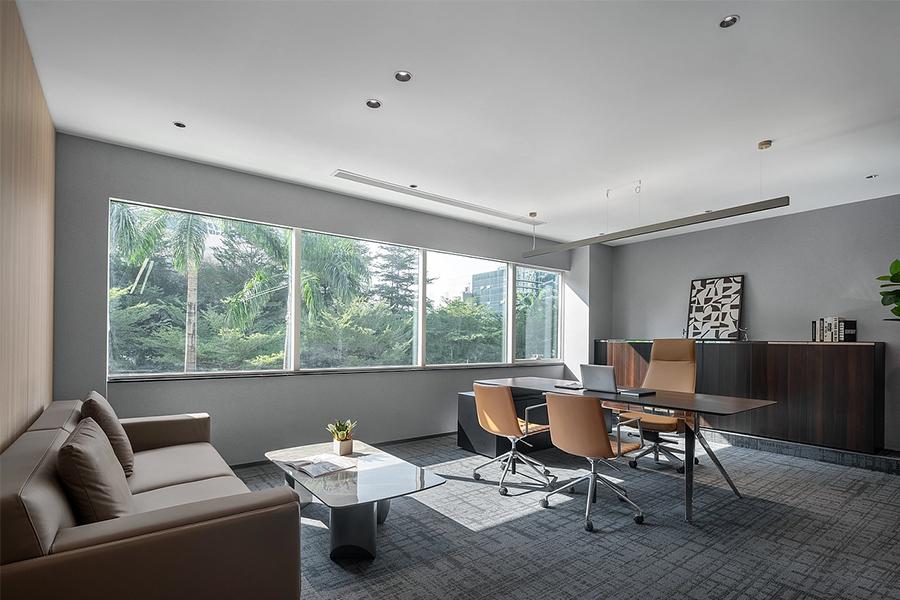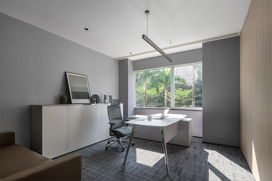 独立办公室的设计则更显静谧与专业。简洁的灰色墙面搭配温润的木质元素,营造出沉稳大气的氛围。宽大的窗户将充足的自然光线引入室内,窗外的城市绿意与繁华景致尽收眼底,让身处其中的人既能专注于工作,又能随时与外界的美好相连。桌上的绿植与简约的装饰,为空间增添了几分雅致与生机,使这里成为了一个能让人沉下心来、高效产出的工作港湾。