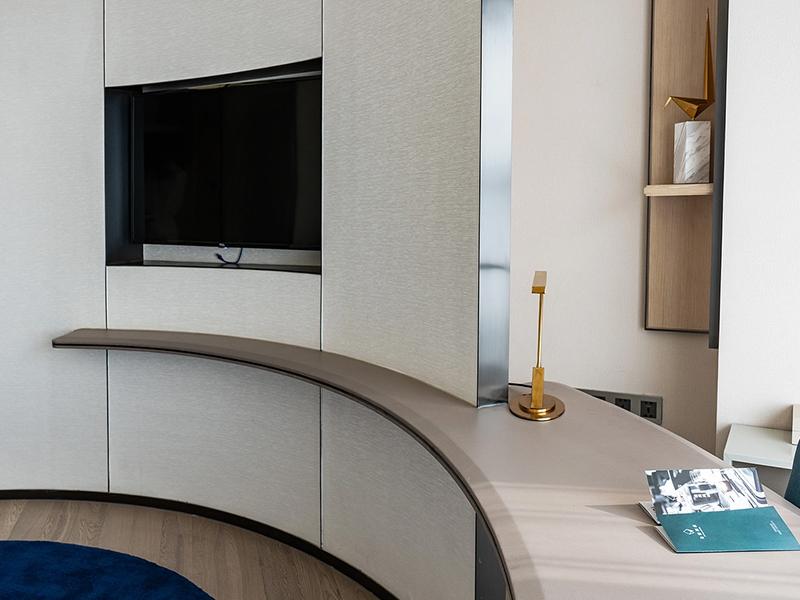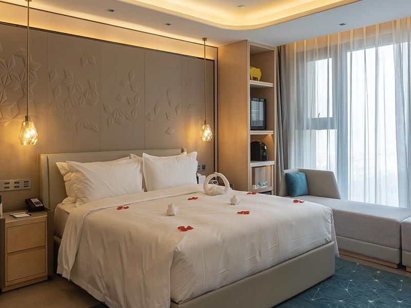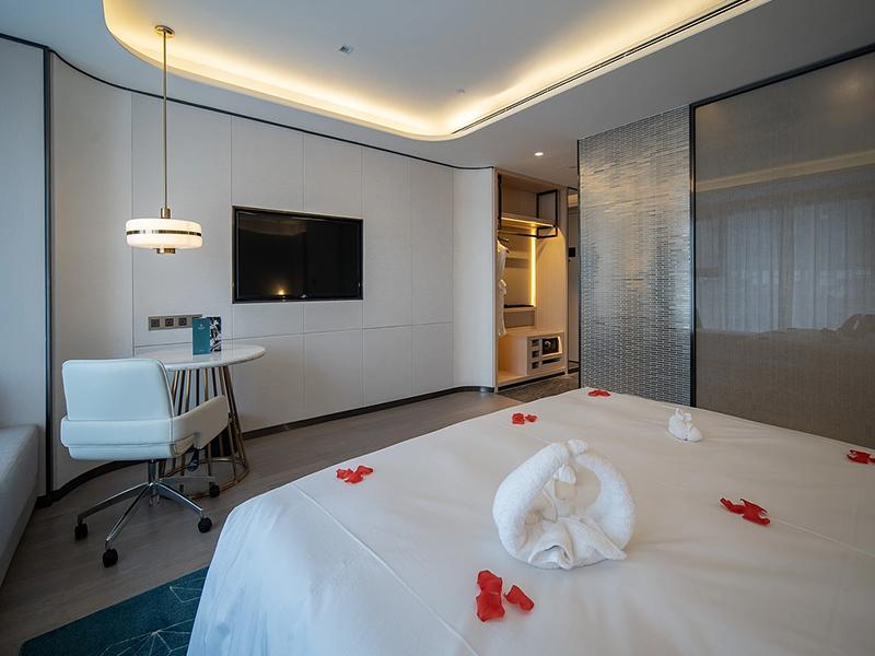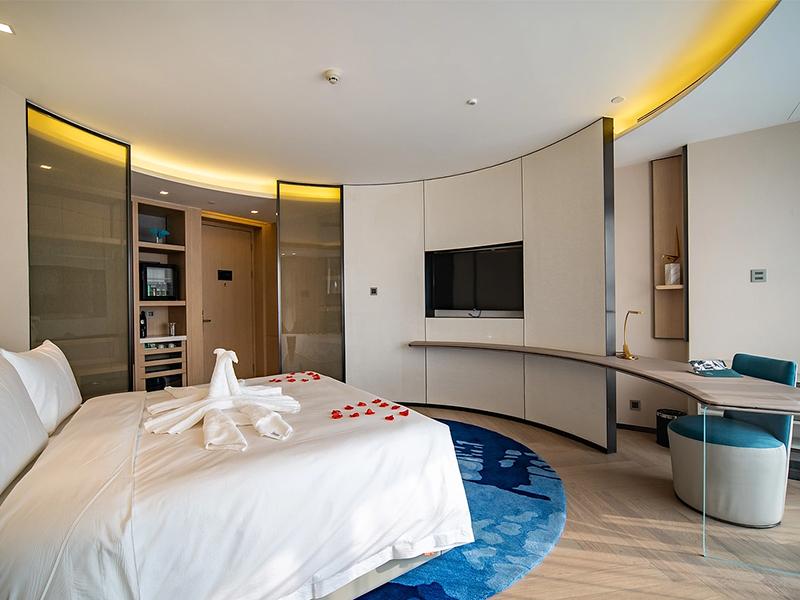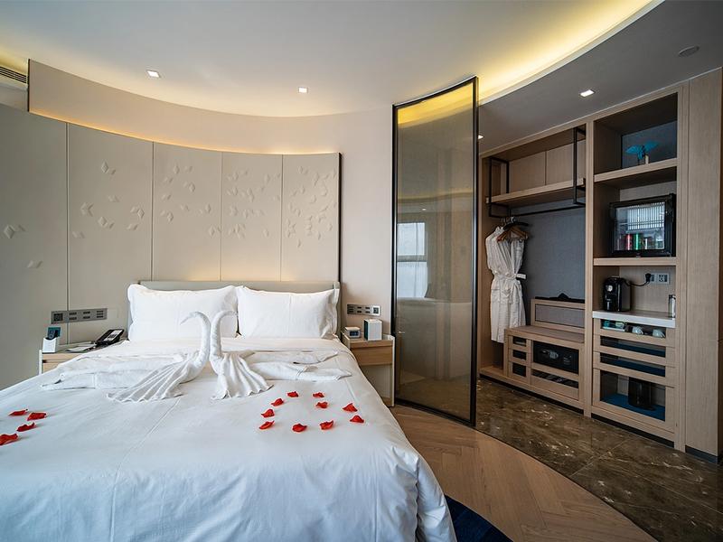 从空间呈现来看,酒店设计方案在功能布局上兼顾实用性与体验感。睡眠区以整洁的双人床为核心,床品选用高支棉材质,触感柔软亲肤;床上精心用毛巾折叠成天鹅造型,点缀的玫瑰花瓣不仅增添了浪漫温馨感,更体现了工装设计对细节仪式感的把控。休闲与办公区配备高清电视与简约书桌,书桌线条利落、储物功能充足,满足住客休闲娱乐与商务办公的双重需求,让空间使用更具弹性。