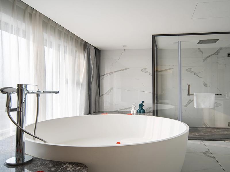 浴室设计是本次酒店装修设计的亮点之一,采用大理石元素打造墙面与地面,纹理自然细腻,既提升了空间的质感与格调,又具备耐磨易清洁的工装特性。独立浴缸的设置更是点睛之笔,搭配简约的卫浴五金,让住客在旅途之余可享受放松泡澡的惬意。