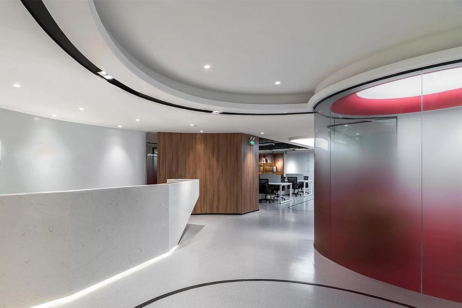 走进万科大厦的这处办公室,首先映入眼帘的是充满现代感的前台区域。四川壹西格玛建筑工程有限公司摒弃了传统前台的刻板印象,以流畅的弧形线条勾勒出前台的轮廓,搭配质感细腻的白色大理石材质,在灯光的柔和映照下,既展现出企业的大气与专业,又传递出温暖的欢迎氛围。一旁渐变红色的玻璃隔断,似一抹灵动的色彩,为空间注入活力,也巧妙地划分了区域,让前台既独立又与整体空间和谐相融,成为访客对企业的第一份美好印象。