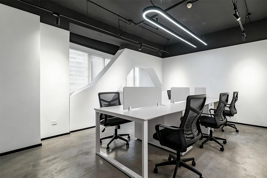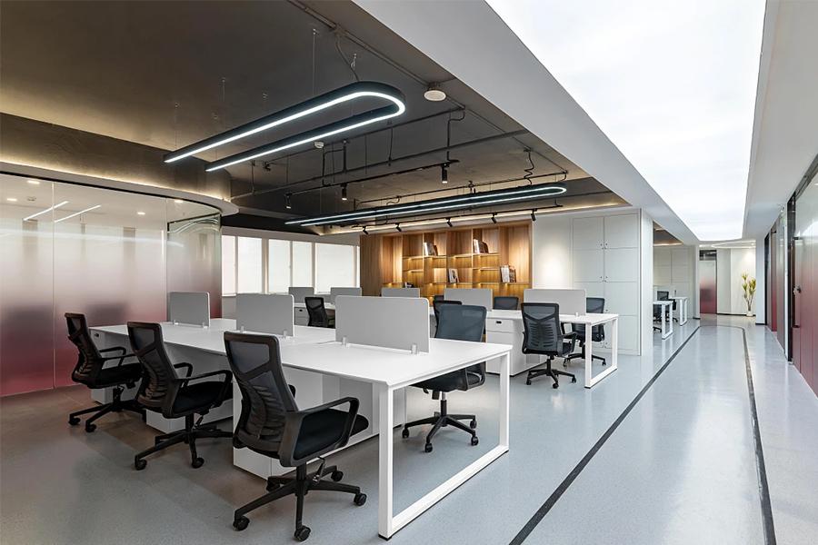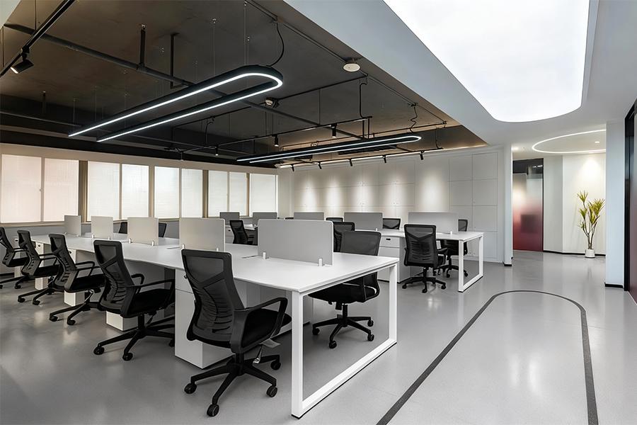 步入办公区,开放与私密的平衡在此处展现得淋漓尽致。四川壹西格玛建筑工程有限公司精心规划了不同的办公区域,既有适合团队协作的开放式工位,白色的长桌搭配黑色的人体工学椅,简洁而不失干练,工位间的白色隔板既保障了一定的隐私,又让空间保持通透。也有相对独立的小办公区,独特的空间造型设计,为需要专注工作或小团队讨论的员工提供了合适的场所。顶部的线性灯具,光线均匀地洒下,照亮每一个工作角落,营造出舒适且高效的办公氛围,让员工能在此处心无旁骛地投入工作,激发创意与生产力。