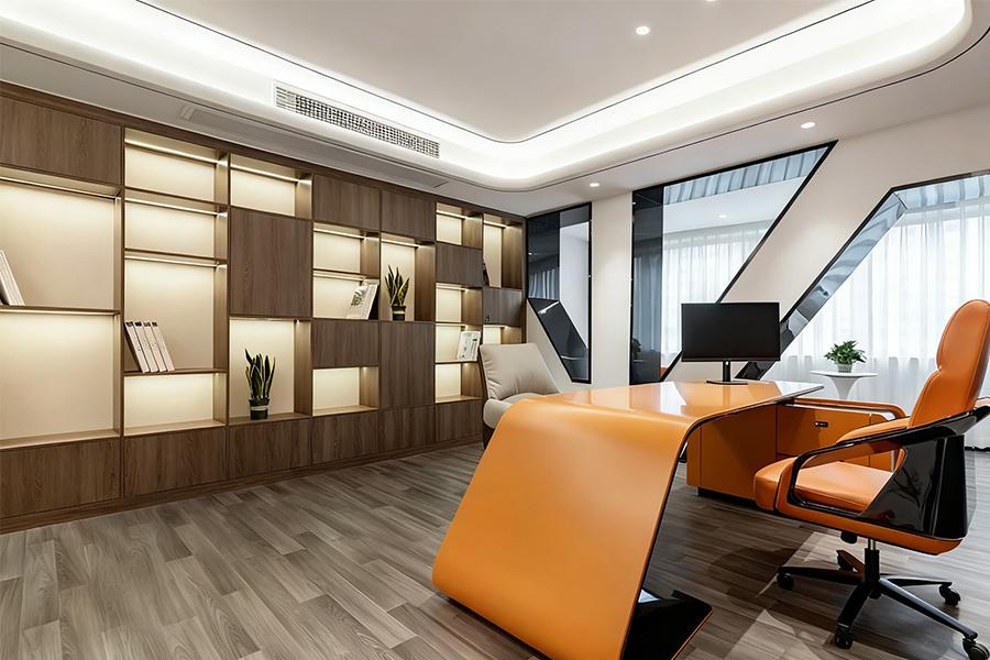 而总经理办公室,则是彰显企业品味与领导者风格的重要空间。四川壹西格玛建筑工程有限公司在此处融入了更多的温馨与质感元素。木质的书架与地板相互呼应,传递出自然与温暖的气息,书架上的书籍与绿植,为空间增添了几分人文与生机。橙色的办公桌与座椅,成为空间中的视觉焦点,既展现出活力与创新,又与整体的沉稳基调相得益彰。独特造型的窗户设计,让自然光线充分进入,营造出舒适、惬意的办公环境,让领导者能在此处从容运筹帷幄。