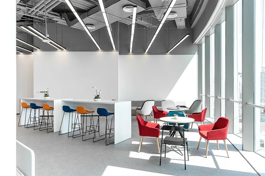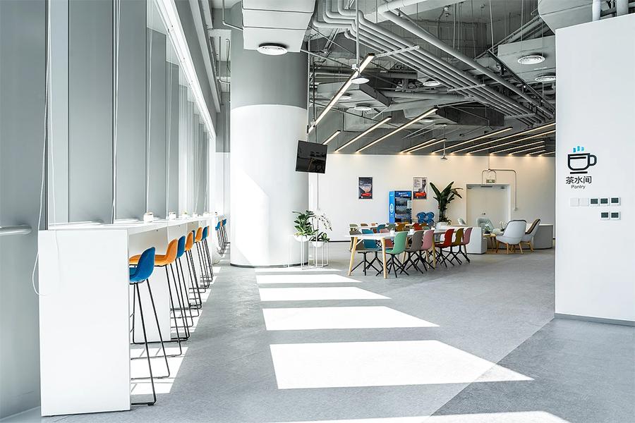 而茶水间的设计,同样体现着对员工需求的细致考量。明亮的空间里,彩色的高脚椅为单调的工作节奏增添了一抹俏皮。长桌与舒适的座椅,可供员工在此用餐、交流。墙上的标识清晰明了,方便员工使用各类设施。充足的采光让整个茶水间显得格外温馨,在这里,一杯咖啡、一次短暂的交流,都可能成为灵感的起点。