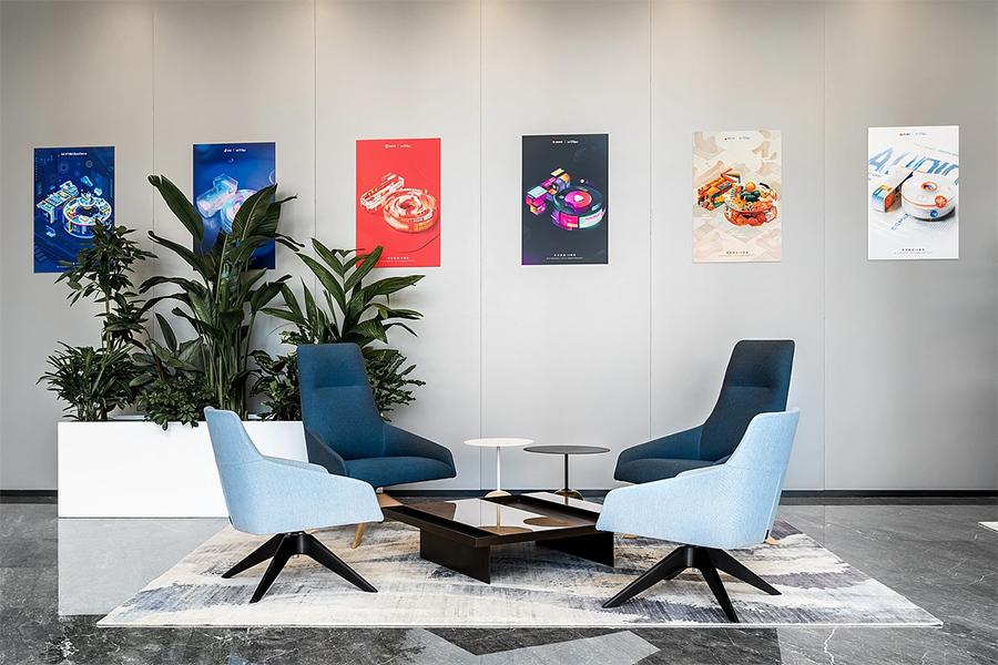 此外,还有供小型交流的洽谈区,舒适的座椅、简约的茶几,搭配墙上富有科技感与艺术感的画作,为商务洽谈或创意交流提供了优雅的环境。在这里,思想的火花能在轻松的氛围中肆意碰撞。