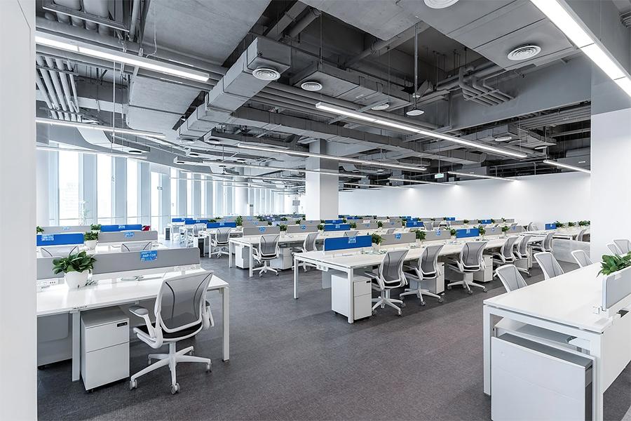 穿过前台,开放办公区如画卷般铺展开来。大面积的白色调让空间显得格外通透敞亮,搭配浅灰色的地毯,营造出冷静、专注的工作氛围。整齐排列的办公桌椅,线条简约流畅,每一处细节都经过精心考量,确保员工拥有舒适的坐姿与充足的活动空间。蓝色的工位隔板,不仅起到了划分区域、保护隐私的作用,更如一抹亮色,为单调的办公场景增添了活力。桌上的绿植点缀其间,让员工在忙碌之余,能感受到自然的清新与生机。四川壹西格玛深谙开放办公的精髓,通过合理的布局与色彩搭配,打破了传统办公空间的沉闷,激发着团队成员间的思维碰撞与协作热情。
