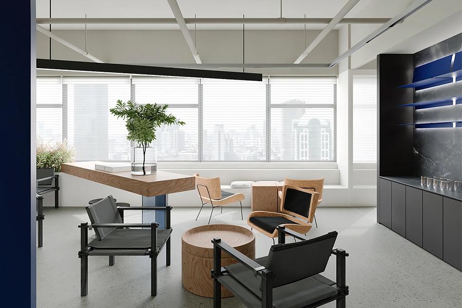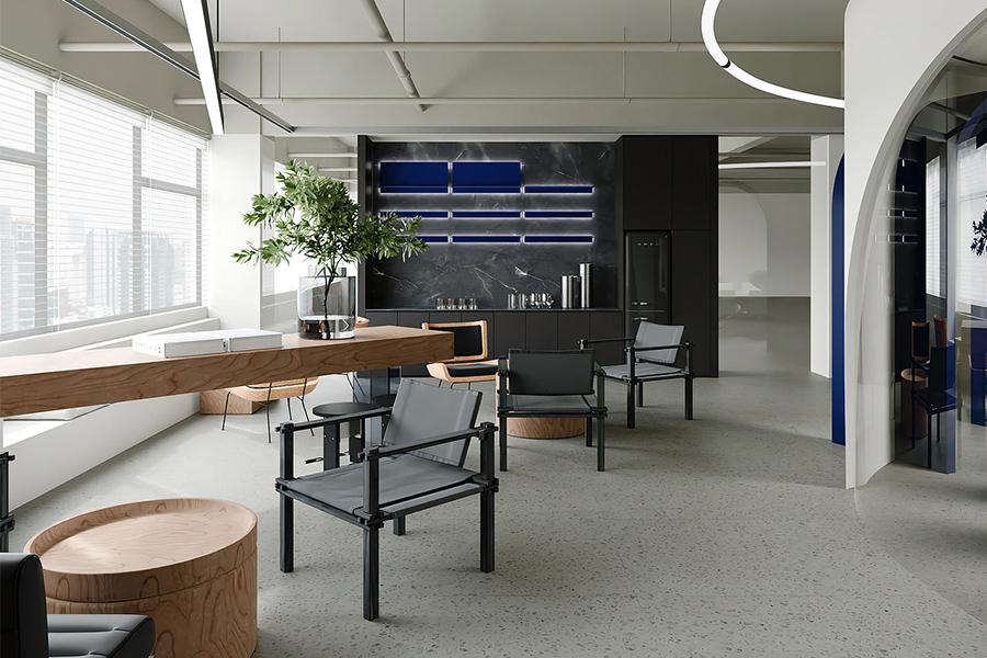 休闲区的出现,为整个办公空间注入了一抹松弛感。木质长桌与圆形小几,搭配造型简约的座椅,营造出温馨的交流氛围。桌上的绿植生机勃勃,为空间带来自然气息,仿佛能让人暂时忘却工作的疲惫。一旁的黑色储物柜与蓝色装饰架相互映衬,既满足储物功能,又成为空间中的视觉亮点。在这里,员工可以放松身心,与同事交流分享,让创意在轻松氛围中自然流淌。四川壹西格玛建筑工程有限公司通过打造休闲区,传递出对员工人文关怀的重视,让办公空间更具温度。