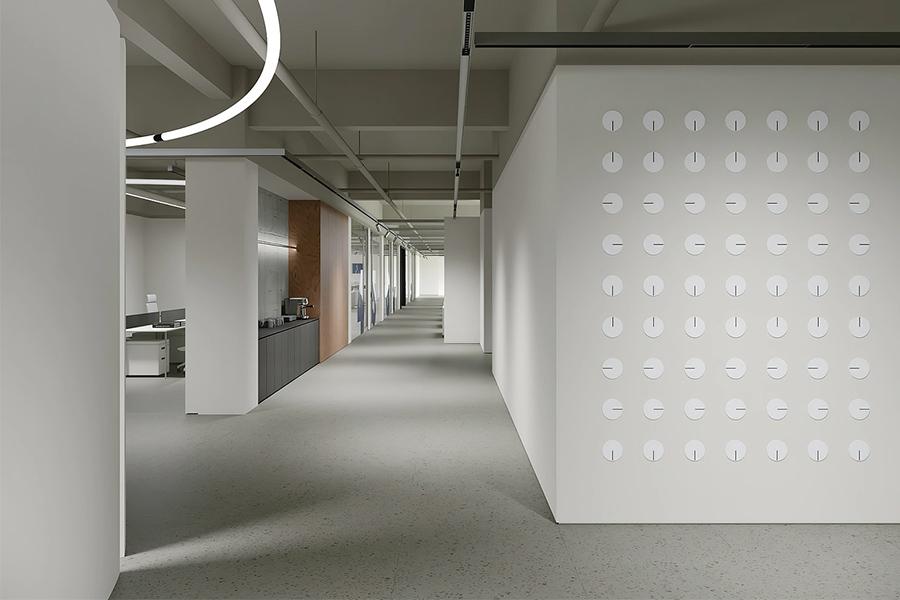走廊区域同样暗藏惊喜。简洁的墙面之上,排列整齐的圆形装饰元素如同一组抽象艺术装置,为空间增添了秩序感与设计感。独特造型的灯具悬于上方,光线在墙面与地面间营造出丰富的光影层次,让原本单调的走廊也成为了展示空间美学的长廊。
