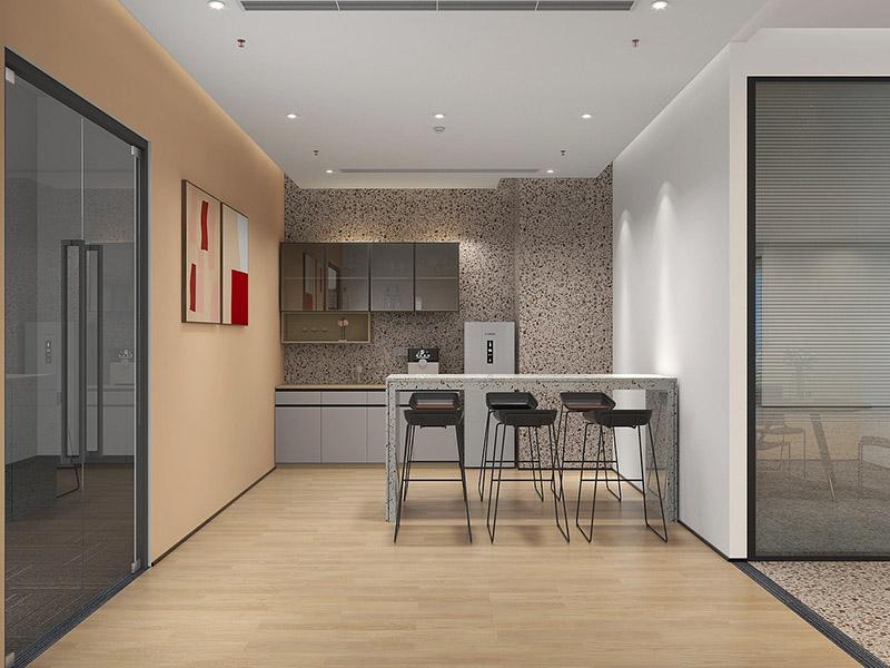 茶水间的设计同样彰显着简约而不简单的巧思。暖色调的墙面营造出温馨的氛围,与浅木色的地板相得益彰。简洁的橱柜与吧台,满足了员工日常的茶饮需求,几把高脚凳错落摆放,既方便实用,又为空间增添了几分随性的时尚感。墙上的装饰画,色彩明快、构图简洁,为这个小空间增添了艺术气息,悄然呼应着建筑设计中对美学细节的考究。