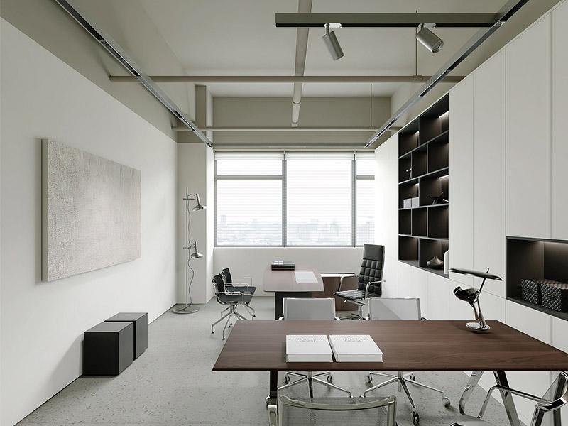 针对独立办公与洽谈室,壹西格玛装修设计以黑白灰为基底,融入温润木色,构建出沉稳且富有质感的空间基调。黑色格状展示柜内置柔光照明,在突出陈列品精致感的同时,为空间增添了层次感与精致度;木色办公桌搭配利落的金属框架,将自然温润与现代冷峻巧妙平衡,尽显时尚简约的设计品味。在家具甄选上,壹西格玛更是细节至上,无论是带有经典格子纹理的黑色办公椅,还是极具质感的金属办公灯,每一件家具都经过精心考量,于细微之处彰显品质,让独立办公与洽谈空间既满足高效工作需求,又传递出企业的专业格调。