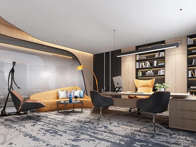 在独立办公空间设计中,壹西格玛尽显对细节与格调的把控。休闲型经理办公室内,浅灰色布艺沙发与大理石茶几构成舒适休憩区,浅木色办公桌搭配棕橙色办公椅,简洁又精致;背景墙深色木质置物架上,书籍、绿植与装饰画错落摆放,丰富空间层次,传递人文气息。高管办公室更显奢华与设计感,姜黄色弧形沙发与同色系高背办公椅形成视觉焦点,搭配艺术雕塑、定制书架与黑色金属线条落地灯,每处陈设都彰显高端品味,蓝灰色艺术地毯进一步提升整体质感。