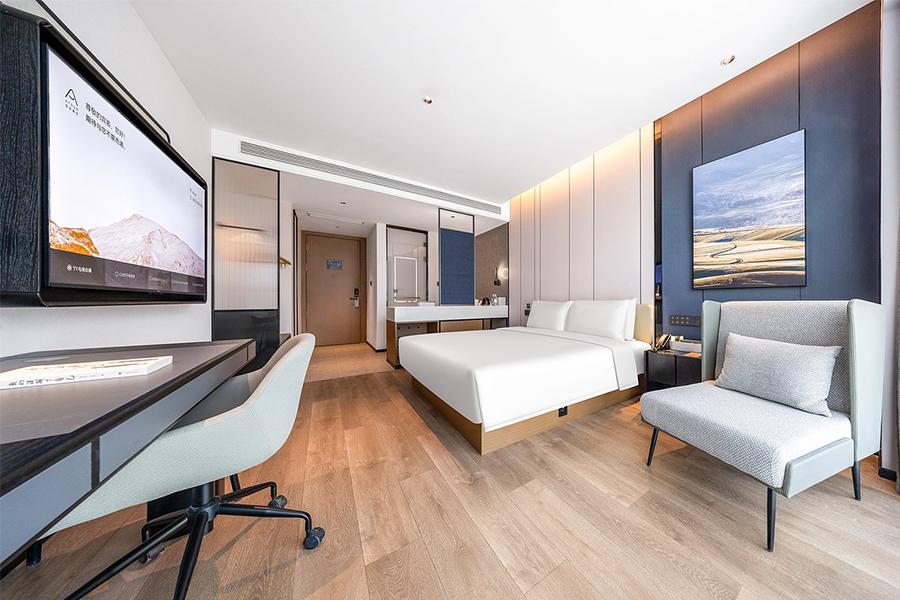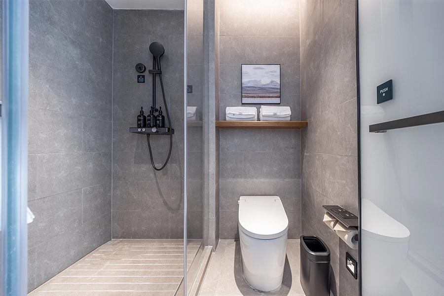功能与美学的共生,是四川壹西格玛建筑工程有限公司设计哲学的核心。客房动线的规划处处体现着对人居体验的深度考量,睡眠区的大床、工作区的人体工学桌椅、休闲区的沙发小几,各自成区却又浑然一体,可旋转的电视装置更是巧妙地适配了不同场景的使用需求,无论是独处休憩还是亲友小聚,都能在空间里找到最舒适的姿态。卫浴间的灰色调美学同样令人称道,通体灰色瓷砖营造出冷静克制的氛围,智能马桶、精致的黑色五金件、原木搁板上的毛巾,每一处细节都彰显着四川壹西格玛建筑工程有限公司的精工品质,那些看不见的工艺,如瓷砖的平整度、五金的阻尼感、灯光的色温,都经过反复调试,只为给住客带来 “无需思考的舒适”。