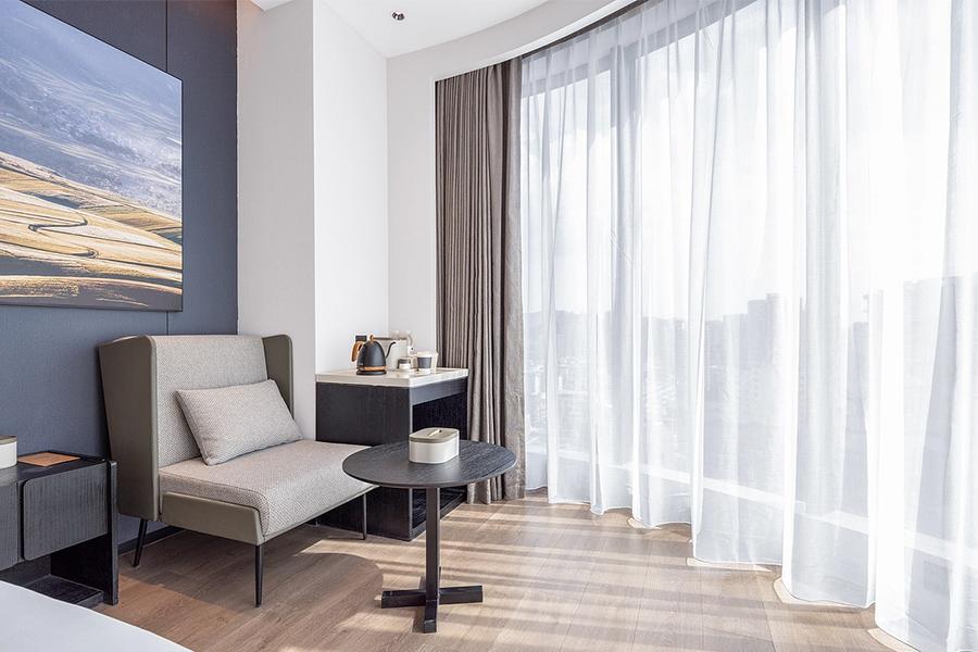客房空间里,大幅落地窗如同一帧动态的城市切片,将成都的天际线、街巷绿意甚至远处的山影都框成了天然的艺术布景,晴时明朗,雨时朦胧,恰似老成都人泡茶馆时看天听风的悠然心境。而墙面那些以沙漠荒原为意象的艺术画作,又暗合了成都作为西南枢纽,兼容并蓄、连通四方的城市气质,在现代设计的语境下,完成了一次对在地文化的抽象转译。四川壹西格玛建筑工程有限公司从不追求符号的堆砌,而是将文化基因拆解为线条、色彩与质感,让它们在空间里自然生长,让住客于潜移默化中,便能触摸到成都的精神脉搏。
