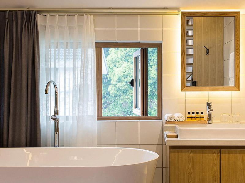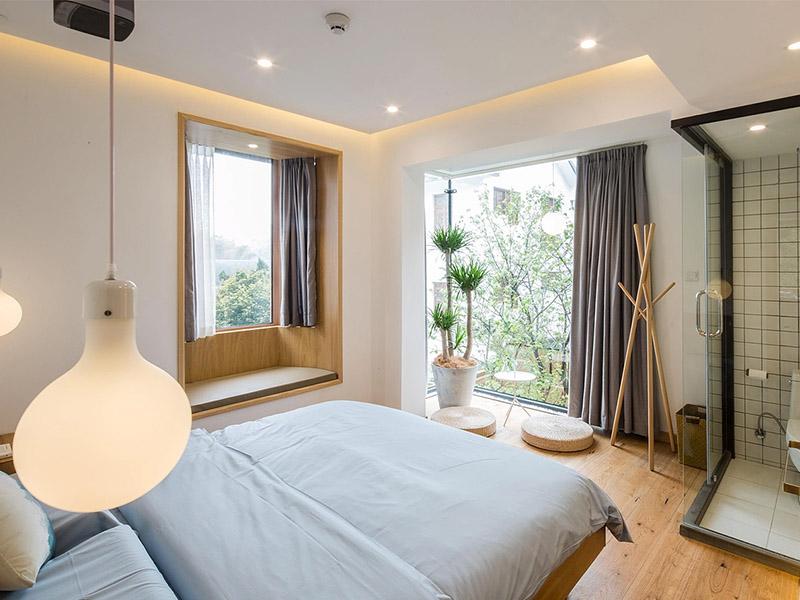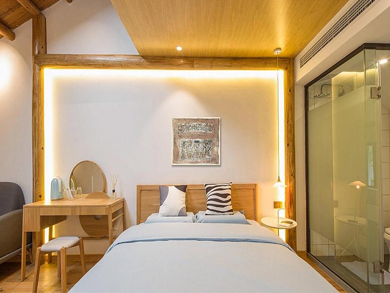 空间的功能划分从不是生硬的割裂,而是流动的有机整体。玻璃隔断将不同功能区巧妙区隔,既保证了空间的通透感,又实现了功能的独立;大窗户的设计让自然光线肆意流淌,窗边的休憩区或是一株绿植,或是一方小榻,让空间不再只是单一功能的场所,更成了与自然共呼吸的疗愈空间。保留木质结构原始质感的空间里,新旧材质的碰撞,让历史的厚重与现代的轻盈在此交融,梳妆台与休闲椅的搭配,更让空间兼具了实用性与美学性,每一处角落都透着设计师对生活细节的考量。