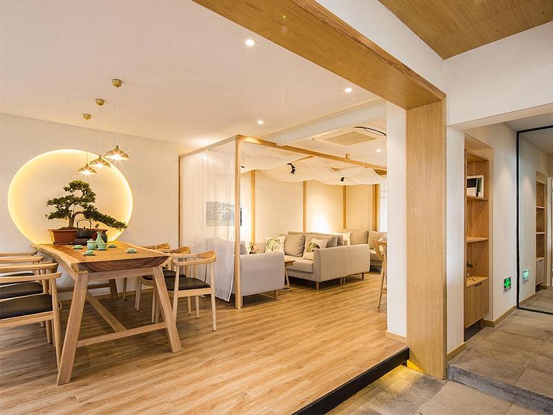 公共区域是壹西格玛设计哲学的集中展示。木质餐桌搭配简约餐椅,中式盆景与圆形灯光装置相映成趣,中式的雅致与现代的简约在此达成精妙平衡。后方休闲区的纱幔设计,似隔非隔,既营造了私密的会客氛围,又让空间保持了视觉上的连贯性。在这里,喝茶、交谈、静思,每一种生活场景都能找到适配的角落,空间的延展性与包容性,尽显壹西格玛对 “生活场景多元化” 的设计思考。