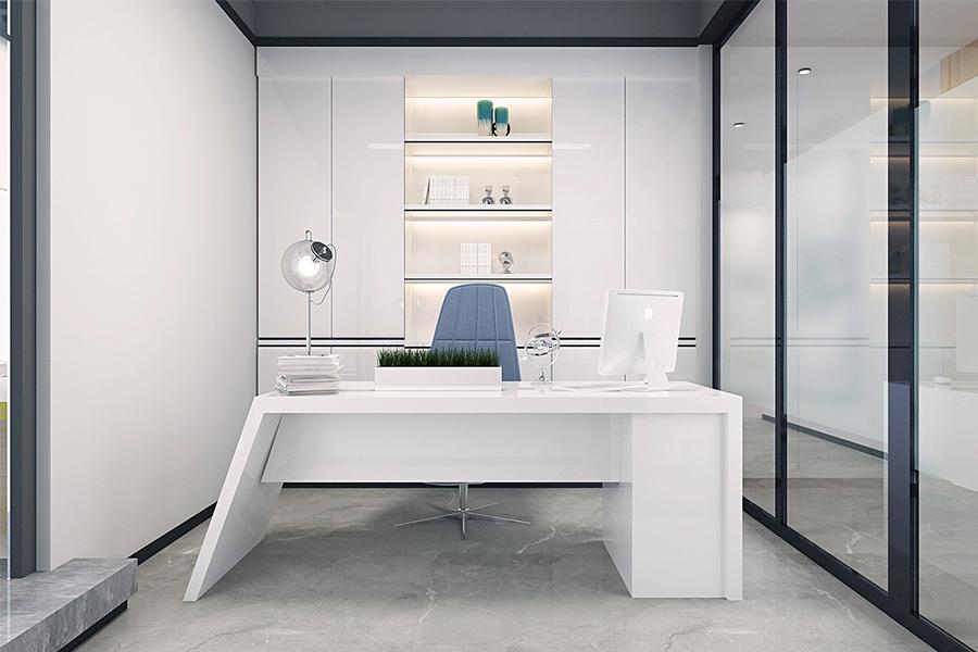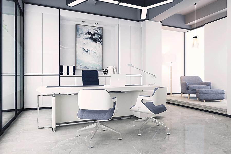 在高效办公之外,壹西格玛对 “人” 的体验关怀尽显于休闲区与茶水间的设计,这里是成都职场人的 “能量补给站”,长条吧台搭配简约白色餐椅,暖光吊灯营造出咖啡馆般的松弛感,茶水间白色橱柜与浅木色茶几的清新组合,蓝色沙发与黄色兰花的点缀,让员工在忙碌间能如在家中客厅般放松,这种 “家的延伸感”,是壹西格玛对成都 “烟火气” 的空间转译。总经理办公室则是领袖气场与人文温度的融合,壹西格玛以白色为主调塑造大气感,定制化白色办公桌线条利落,搭配高级灰与藏蓝色座椅彰显专业,内嵌发光展柜陈列艺术摆件与书籍,角落单人沙发区为商务洽谈预留舒适场景,在这里,壹西格玛用空间语言传递企业价值观:成都郫都区总部里,领导者的格局与温度皆可被空间看见。