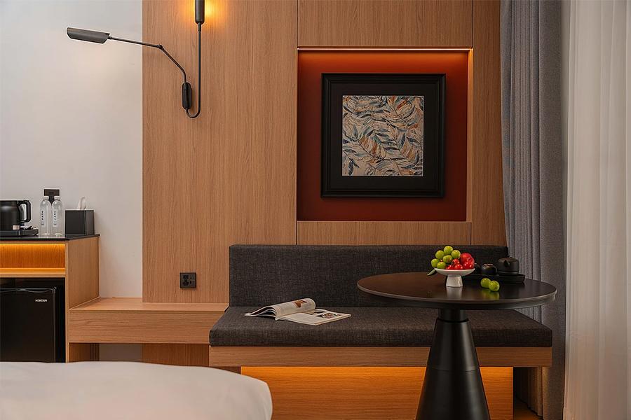 在材质的选择上,团队拒绝 “千篇一律”。客房的木地板采用了仿原木纹理的环保材料,脚感温润且防滑;墙面的艺术挂画,图案灵感来自蜀地的竹林与花卉,色彩雅致却不张扬;就连迷你吧的黑色柜体,都做了圆角处理,在功能性之外,多了一份人性化的温柔。