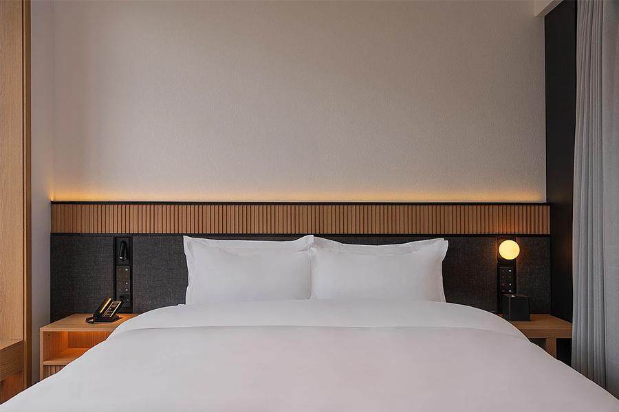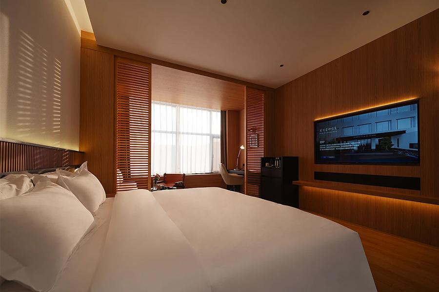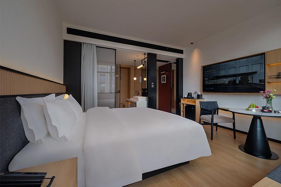 客房的布局堪称 “小而美” 的典范。开放式的卫浴空间以黑色玻璃隔断划分,既保证了通透感,又营造出私密边界;床头的线性灯带如夜空的星河,为休憩时光铺就温柔底色;那盏造型独特的床头灯,灵感或许源自成都茶馆里的竹编灯笼,在现代材质的演绎下,成为空间里的艺术点睛之笔。
