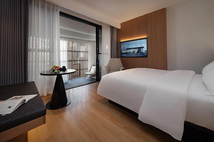 更令人称道的是 “场景化” 的设计巧思。有的客房配备了投影设备,幕布降下时,卧室瞬间变身为私人影院,满足年轻人对 “沉浸式体验” 的追求;有的客房辟出一方露台,木质格栅将光线切割成蜀地特有的慵懒模样,摆上一把藤椅,便能在此复刻 “成都式躺平” 的悠闲;还有的客房设置了雅致的茶歇区,黑陶茶具与鲜果绿植相映成趣,让住客在品茗间,读懂成都人 “把日子过成诗” 的生活哲学。