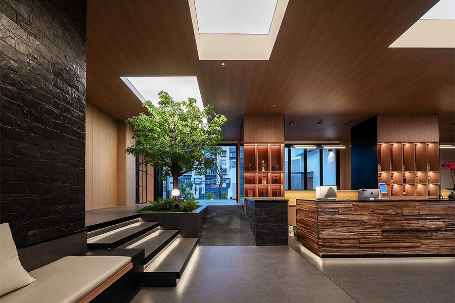 在公区大堂,粗犷的黑色石墙如川西峡谷的褶皱,与暖木色的天花形成强烈对比,天光从方形天窗倾泻而下,落在精心布置的绿植景观上 —— 这是对蜀地 “山、水、林” 自然格局的现代转译。接待台采用层叠的木质结构,仿佛从老成都的木构民居中提取的片段,每一道木纹都在诉说着时光的故事,让初入酒店的客人瞬间感受到在地文化的包裹感。