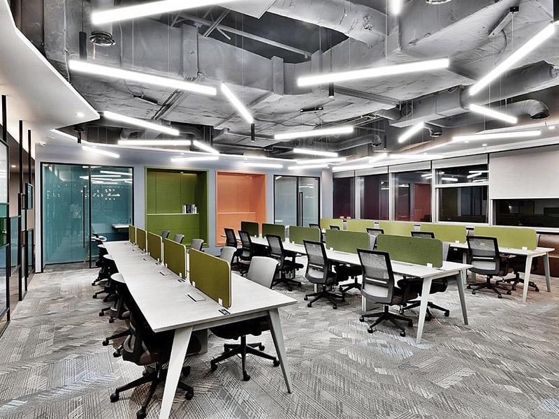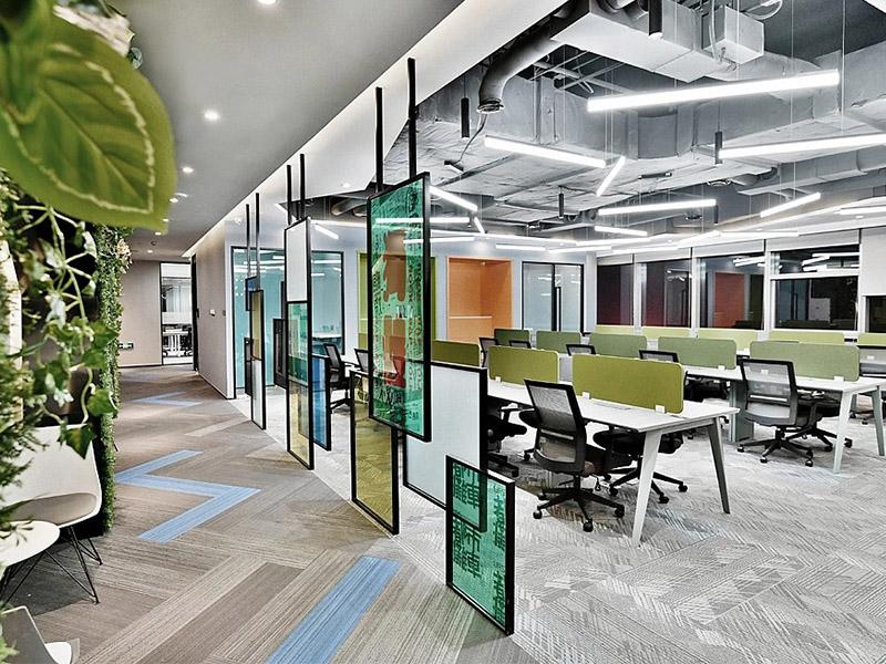 对于开放办公区,壹西格玛突破传统办公空间的刻板印象。通透玻璃隔断保障空间开放性,助力团队协作;活力撞色的工位屏风与工业风吊顶形成视觉对话,既保留办公区的利落感,又以色彩与线条注入创意活力。更妙的是,绿植元素与艺术玻璃的点缀,让冰冷的办公空间焕发生机,完美适配互联网、创意类企业对 “开放、创新、活力” 的场景诉求,真正做到 “让办公环境赋能工作效率”。