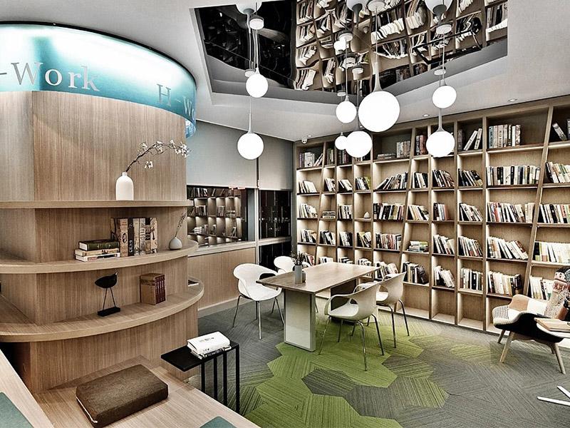 在办公空间的功能融合上,壹西格玛展现出精妙的平衡术。其打造的休闲阅读区,以原木色书架构建知识的 “容器”,搭配简约白色桌椅与灵动球形吊灯,将阅读、轻办公与艺术氛围自然糅合。顶部镜面设计延伸空间纵深感,墙面艺术海报则注入文化灵魂,让员工在忙碌之余,能于此处寻得一方 “精神自留地”,实现工作与休闲的无缝过渡。这种设计不仅提升了空间利用率,更暗合当代职场人对 “工作场景多元化” 的深层需求。