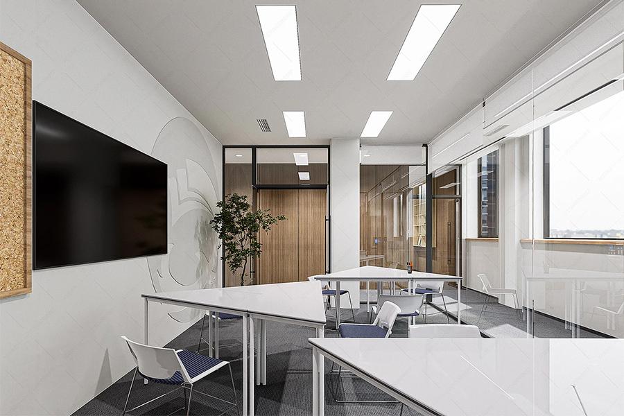 独立会议室里,大面积落地窗引入的充足光线,让每一次头脑风暴都在明亮氛围中展开。白色调的会议桌椅简洁利落,软木留言板与电子显示屏的搭配,满足创意记录与多媒体演示的双重需求。一株中型绿植的加入,为理性空间增添自然的呼吸感,让思想的碰撞在此舒适发生。